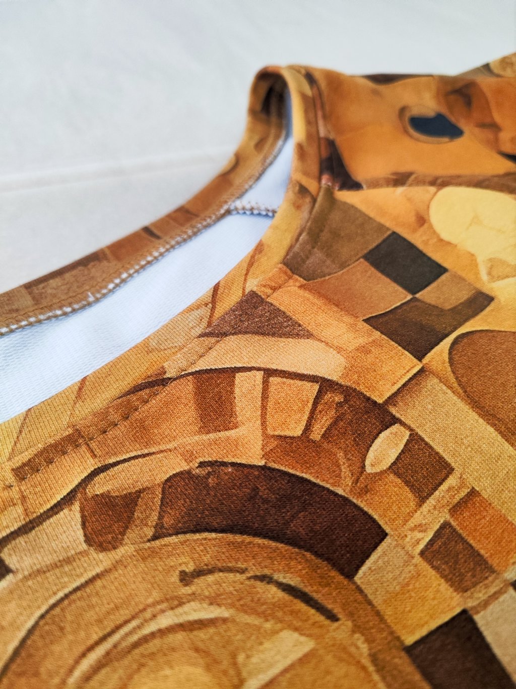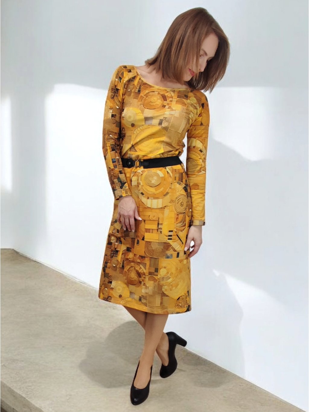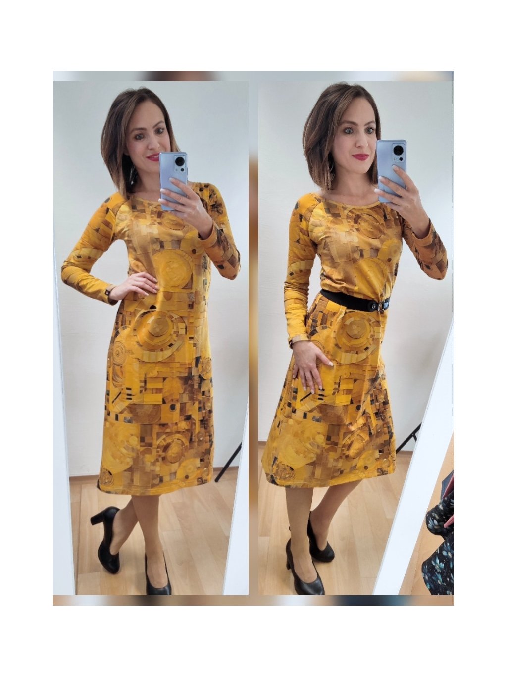 Šaty jsou ušité z celoplošně vzorovaného materiálu. Barvy podzimu: Žluto - okrovo- hnědo zlaté odstíny.