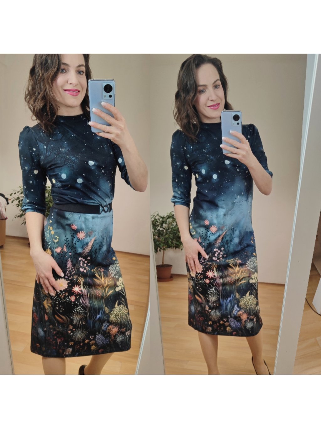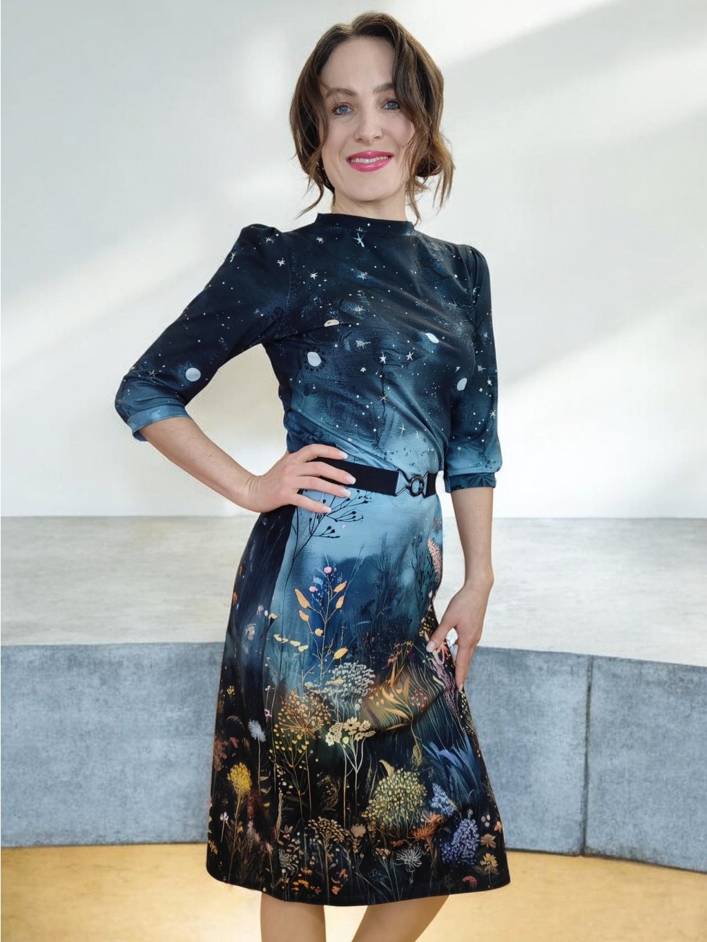 Tyto šaty se stojáčkem MARGO spojují pohodlí, ženskost a nadčasový střih. Polopřiléhavá silueta lichotí postavě a díky možnosti úprav si je přizpůsobíte přesně podle sebe. Vzor „Květy noci“ dodává šatům osobitost a snadno je využijete do práce i na běžný den.