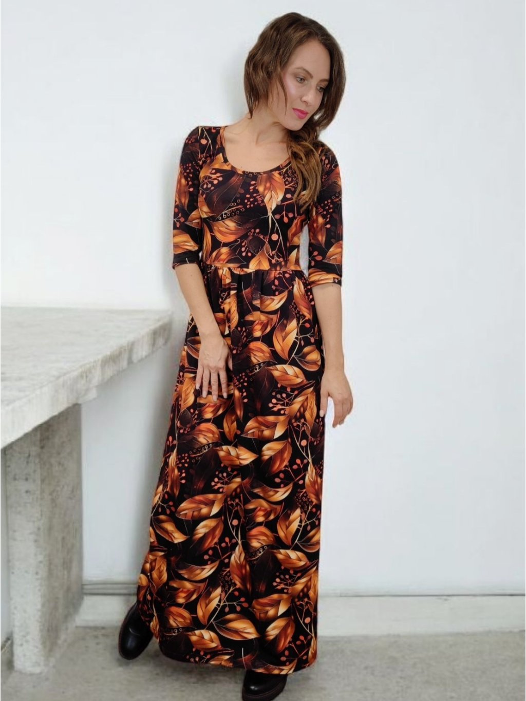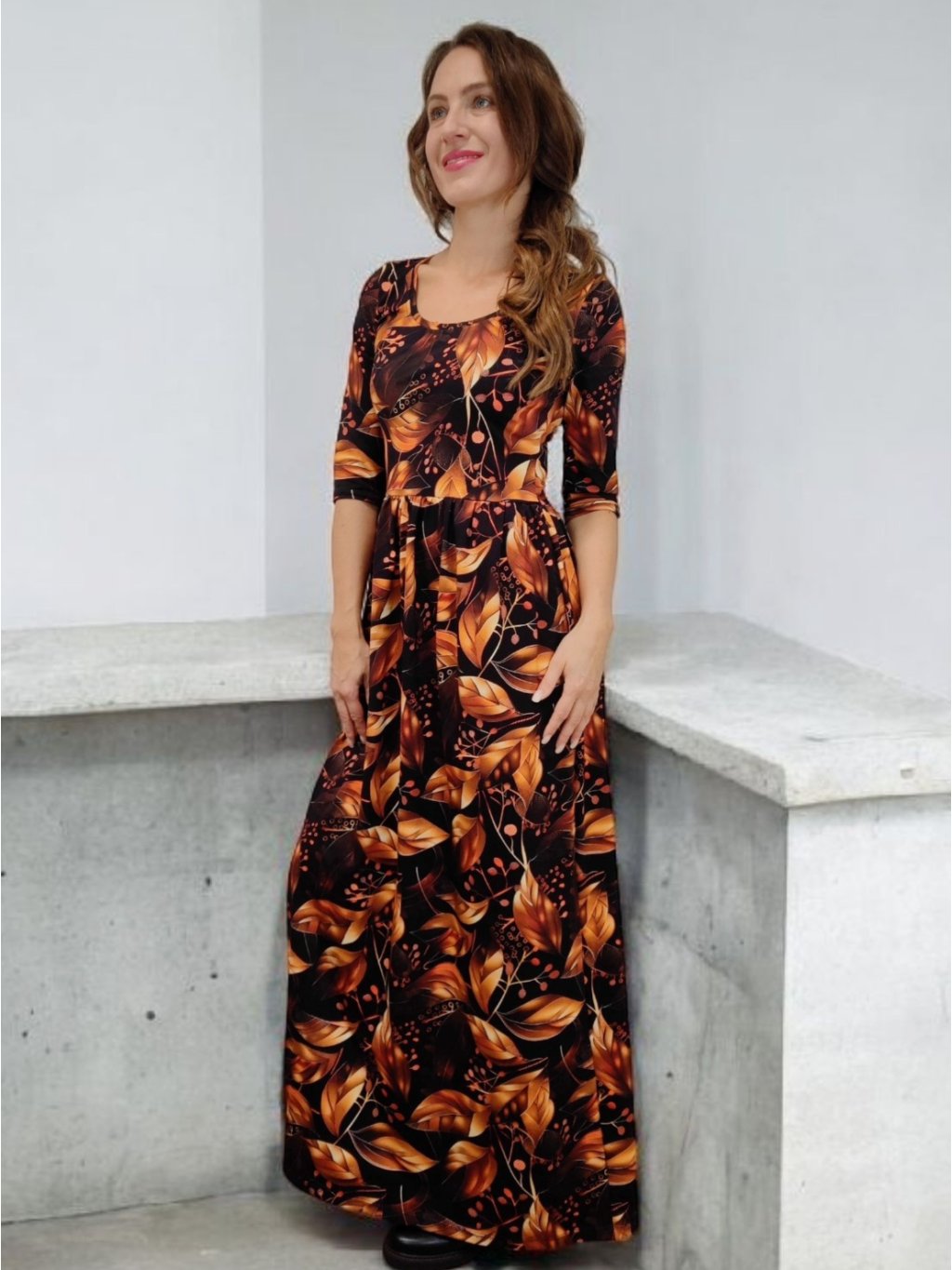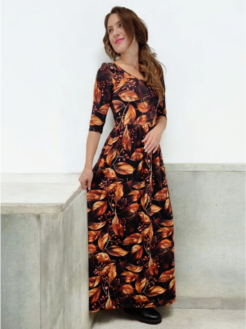 Dlouhé šaty THYMIA, 3/4 rukávy, podzimní listí