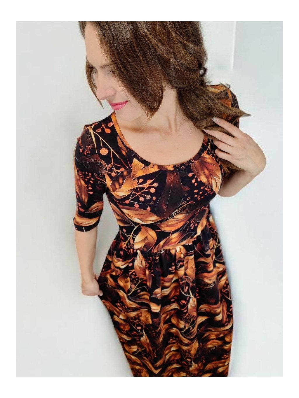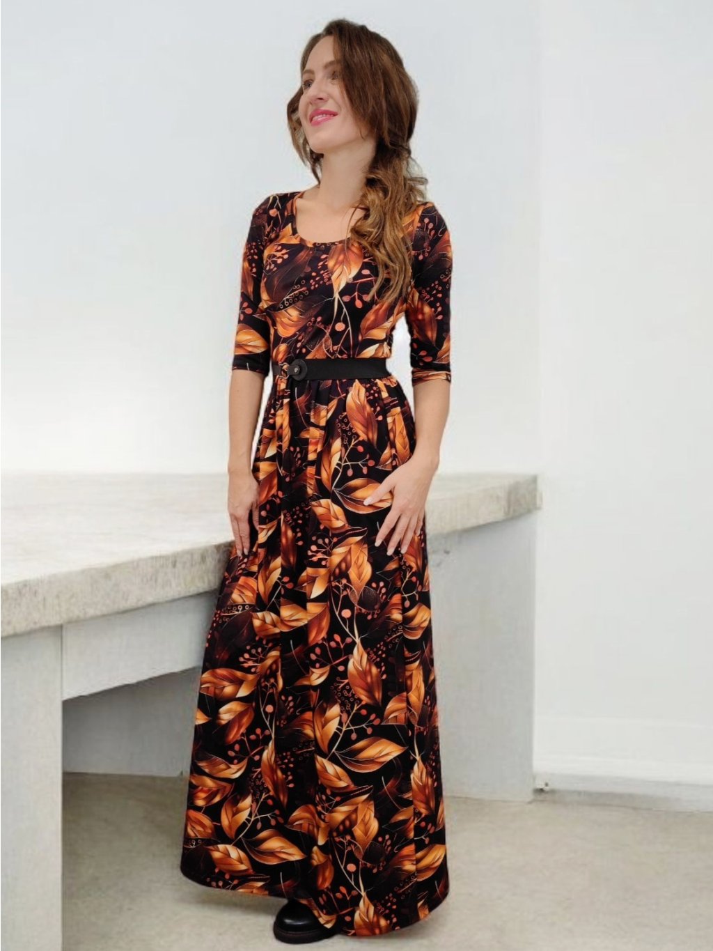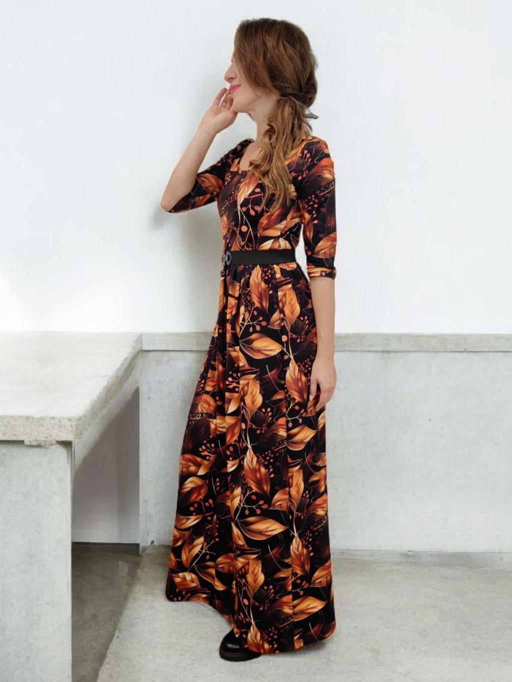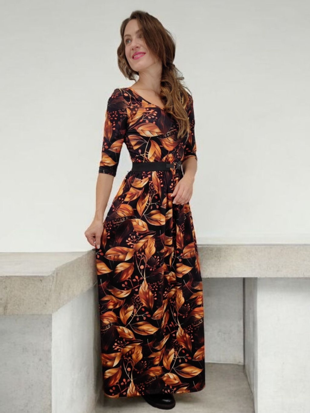Dlouhé šaty THYMIA, 3/4 rukávy, podzimní listí