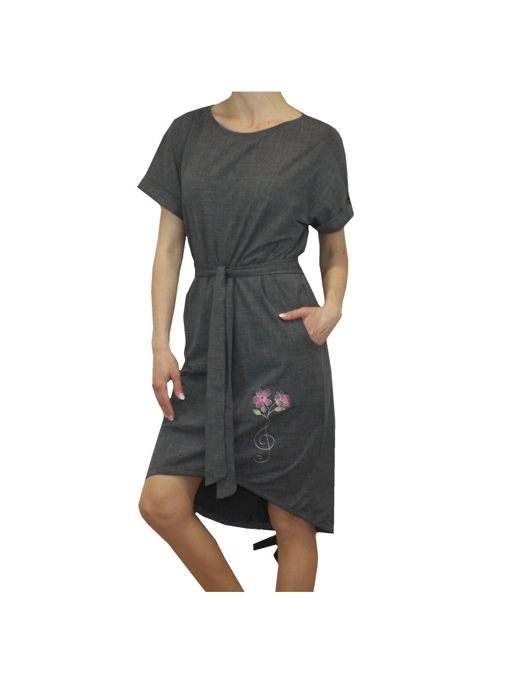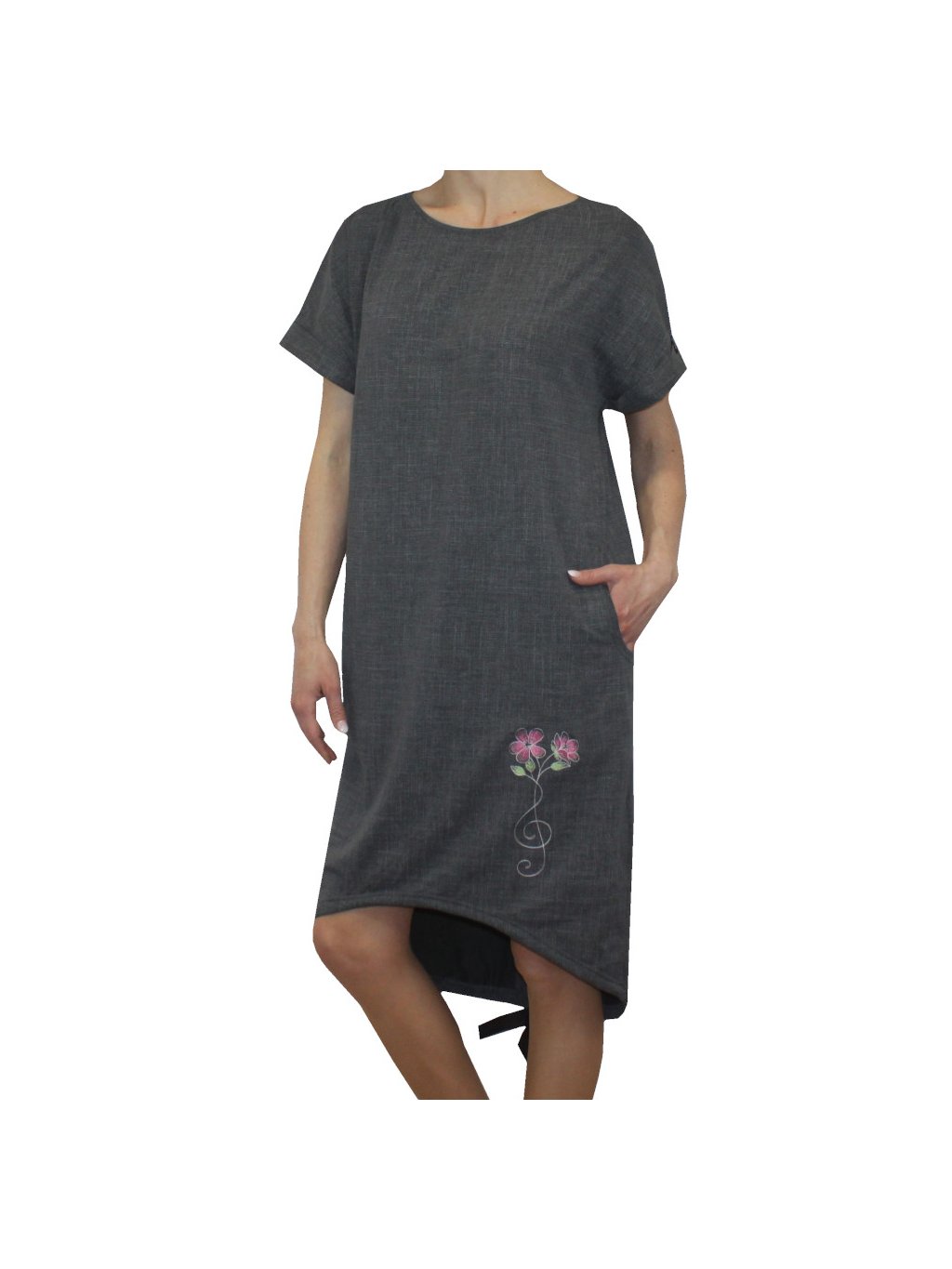 Dámské šaty volného střihu, v bocích mají šaty kapsy. Střih šatů je delší na zadním díle.