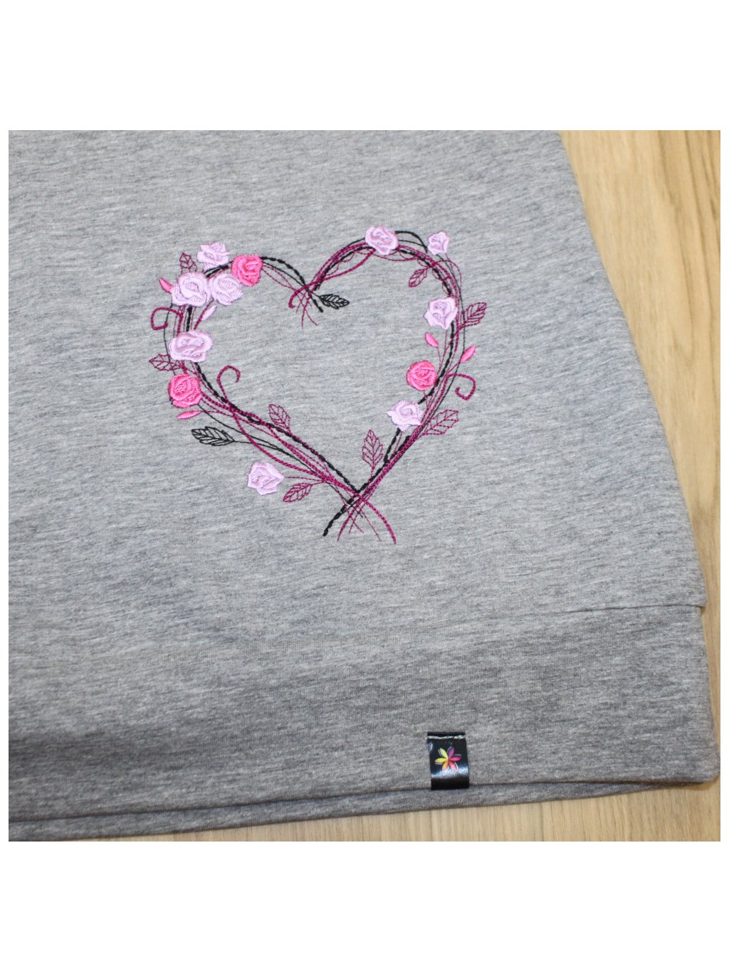 Na předním díle je vícebarevná výšivka srdce.