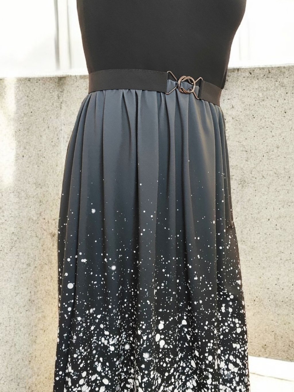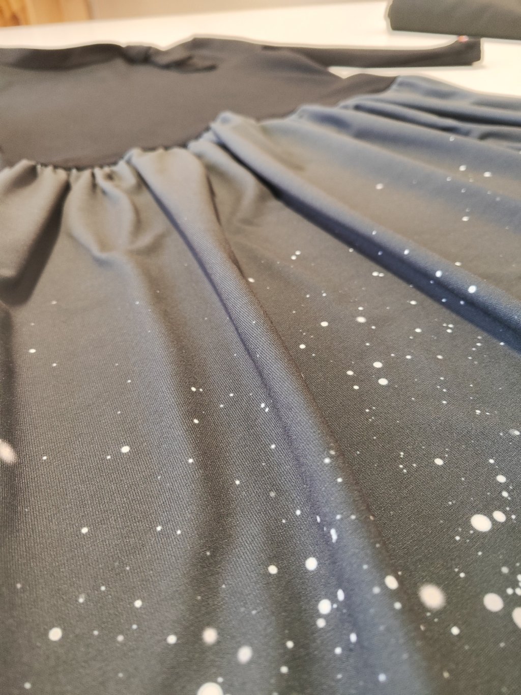Materiál na sukni je polyester - středně silný, nemačkavý, stálobarevný. Šaty ideální na cesty, do kufru. Víc o materiálu v odstavci O polyesteru s respektem k přírodě.