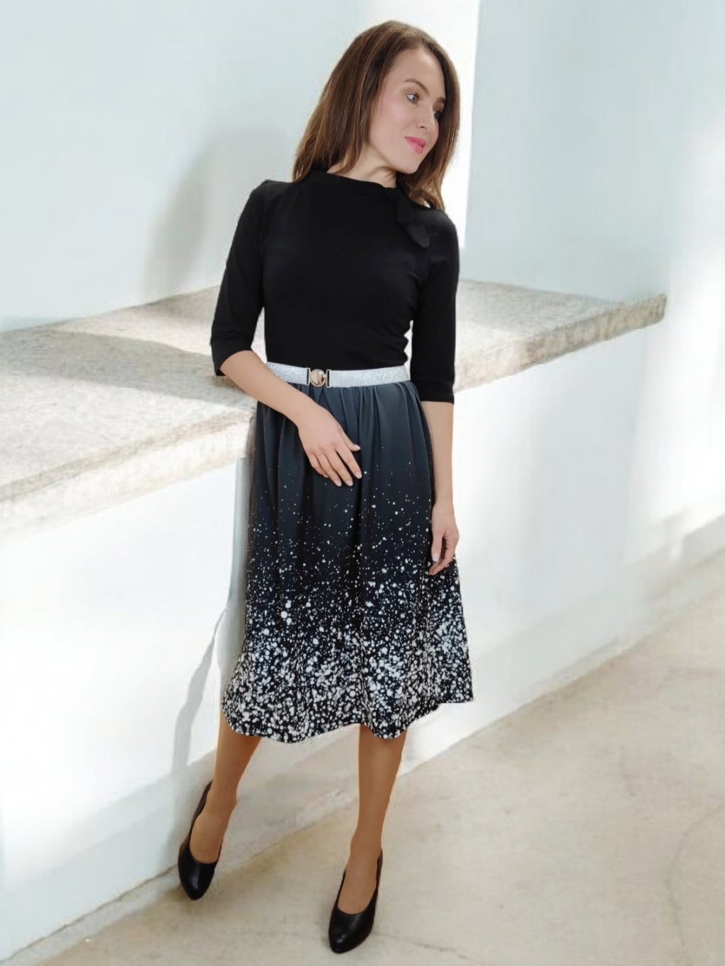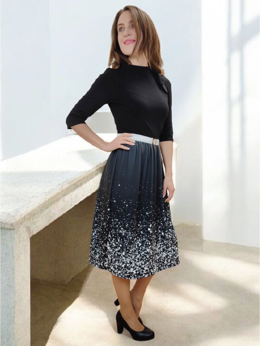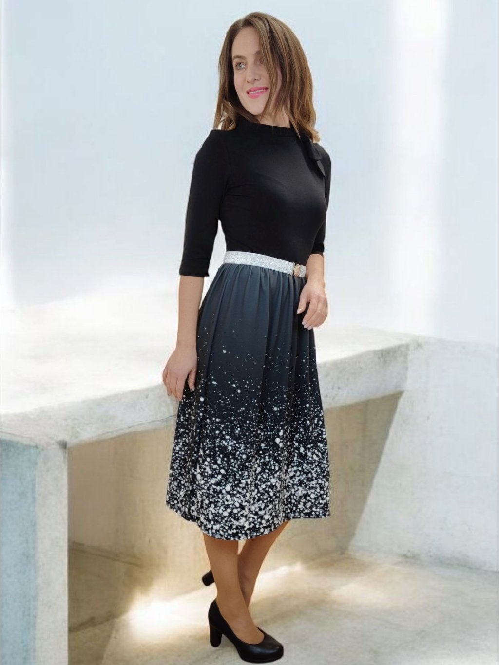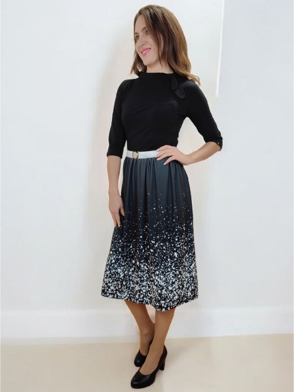 Černé se stříbrně vzorovanou suknicí.