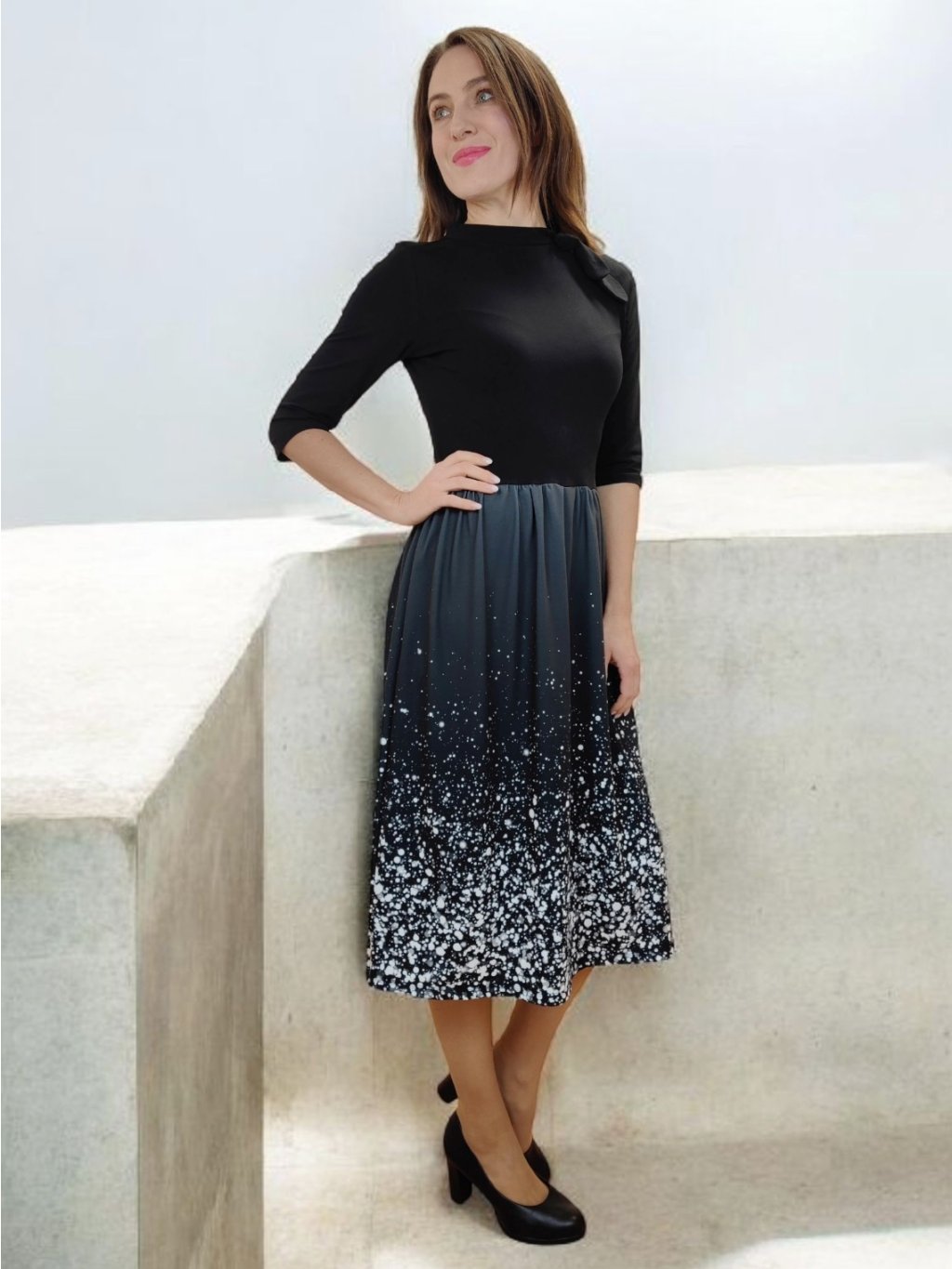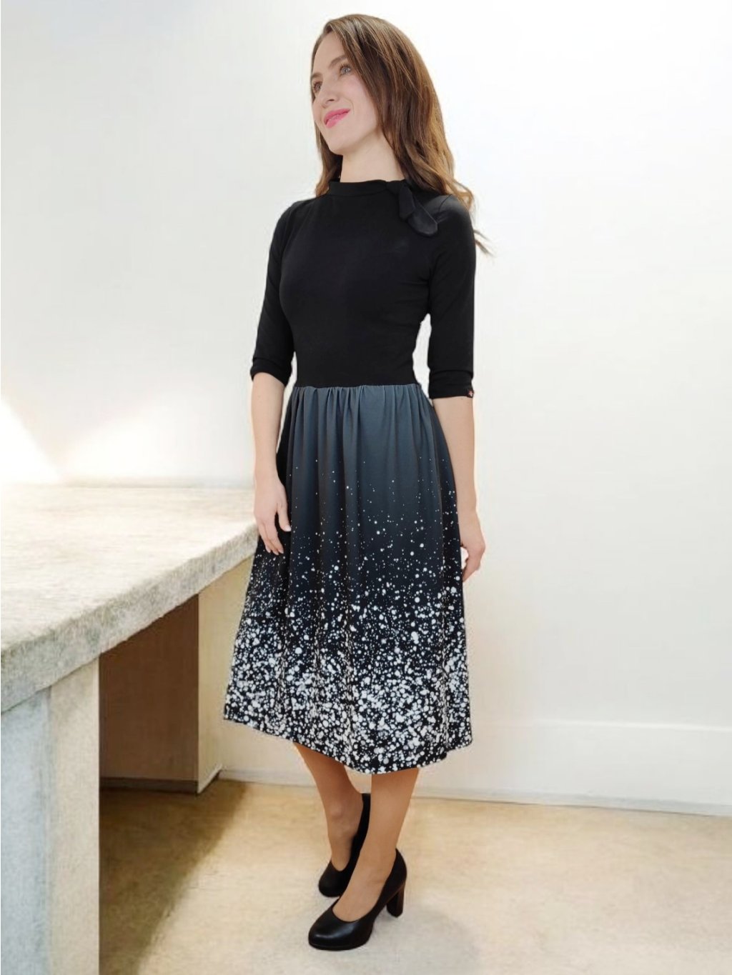 Šaty BLAIR mají přiléhavý živůtek, rukávy jsou 3/4 délky, přestřižení šatů je v místě pasu. Suknice je řasená do pasu.