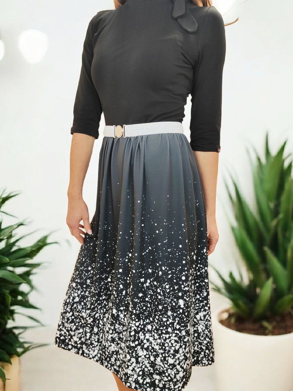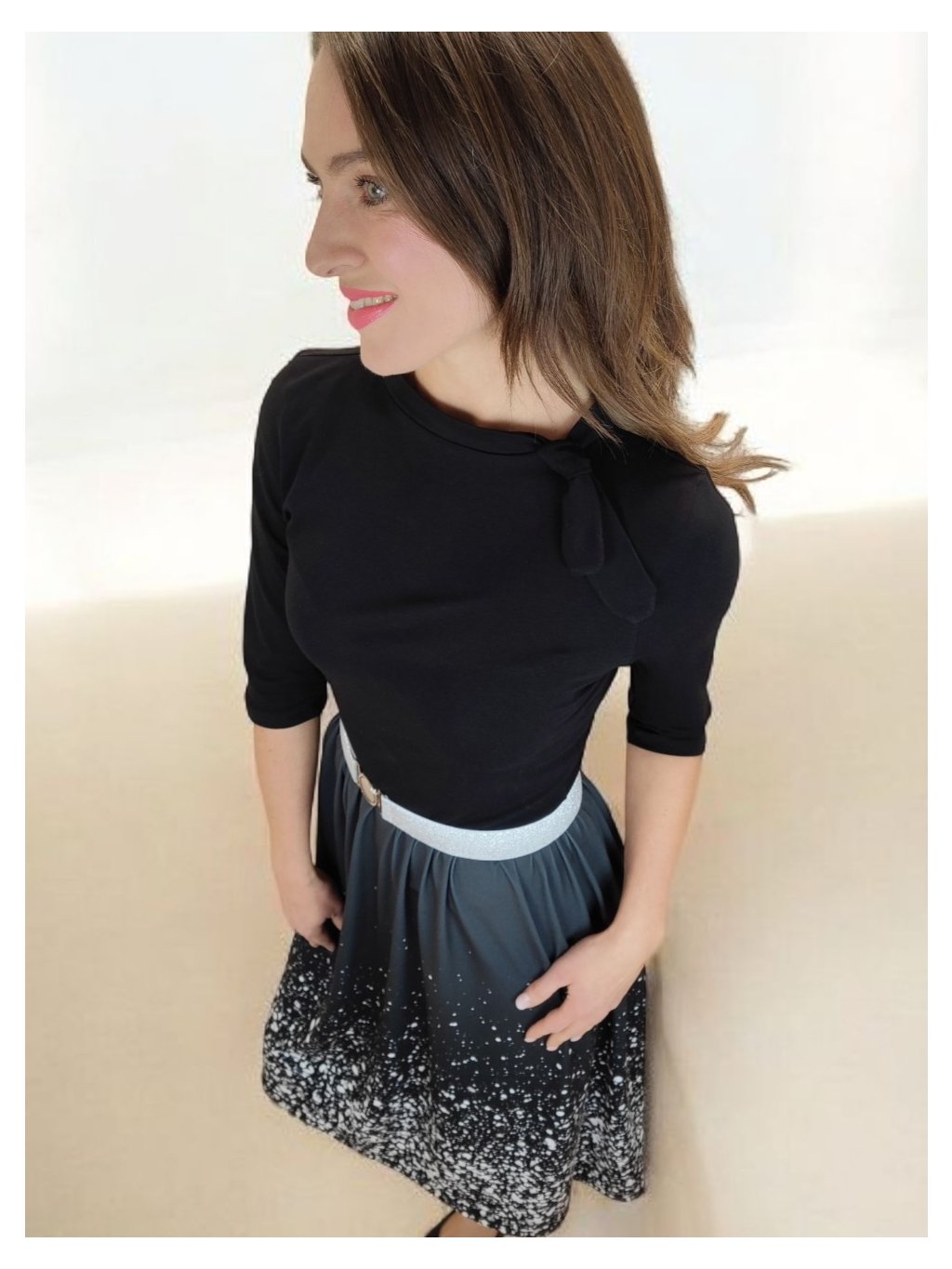 Živůtek v černé barvě dodává šatům klid a vkus, zatímco suknice ve stříbrném třpytu působí jako hvězdná obloha – každým pohybem zachytává světlo a vytváří okouzlující efekt. Působí sofistikovaně, slávnostně a přitom moderně.