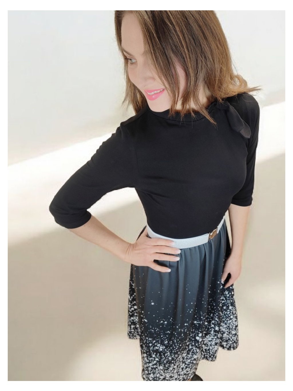 Šaty mají přiléhavý černý živůtek s 3/4 rukávy a nařasenou sukní do pasu. Rukávy můžeme ušít i dlouhé.