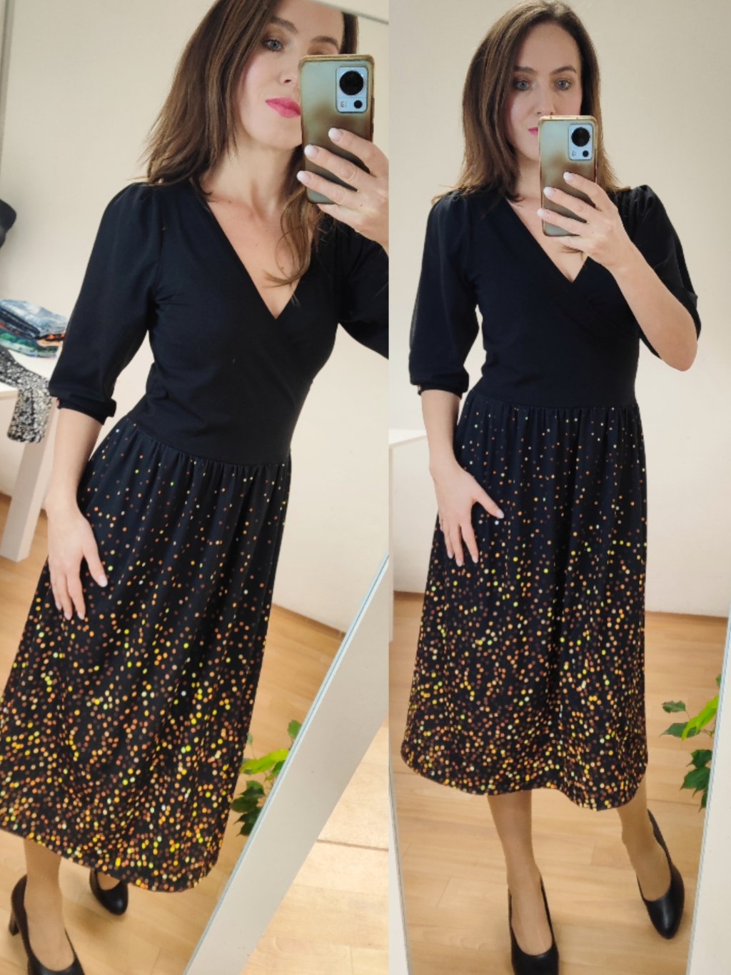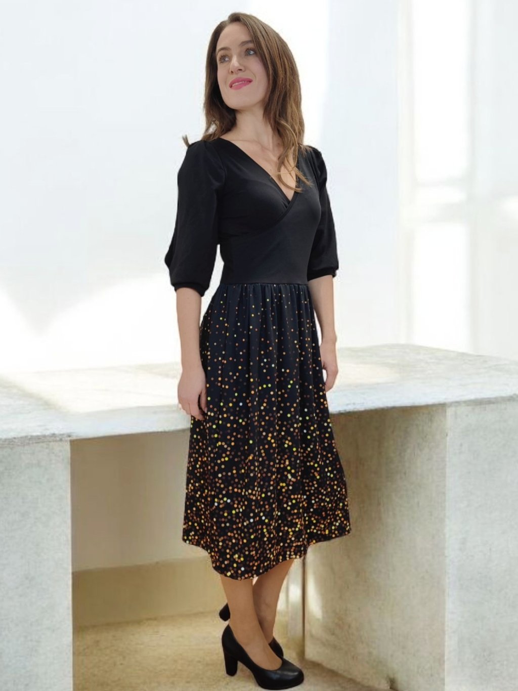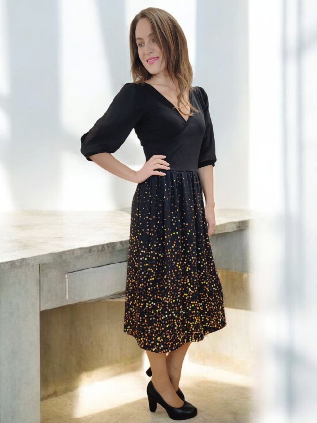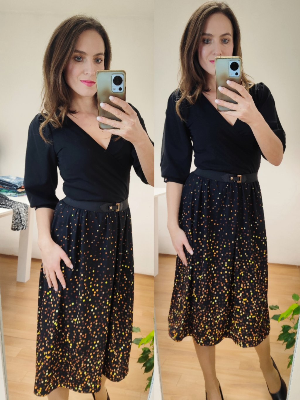 Černý živůtek dodává šatům základní eleganci, zatímco suknice se zlatým třpytem působí jako hvězdná obloha – každý pohyb zachytává světlo a vytváří jemný třpyt. Celkový efekt působí slavnostně, sofistikovaně a s nádechem luxusu – přesně pro chvíle, kdy chcete vyniknout.
