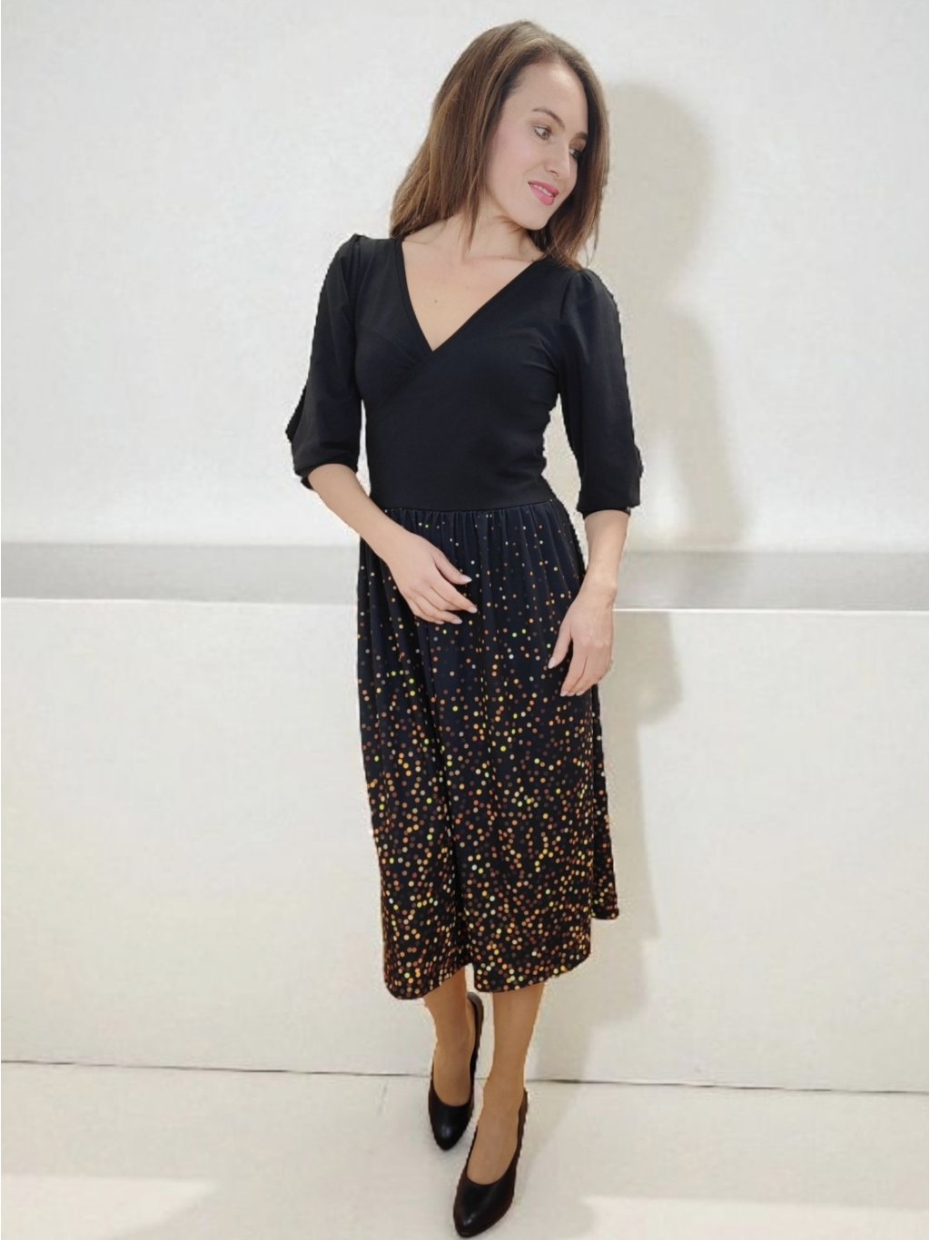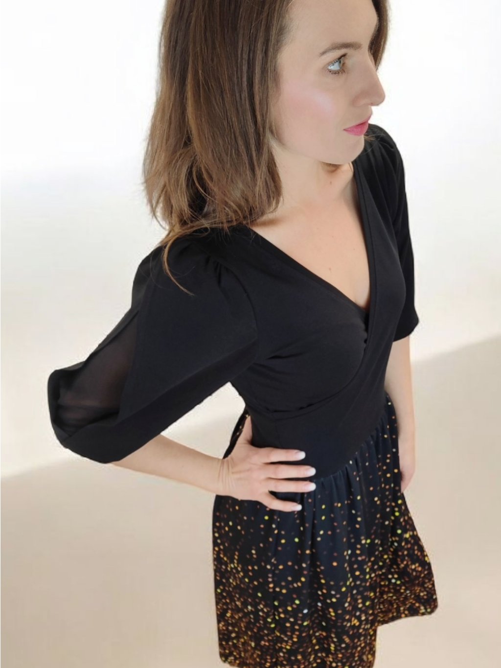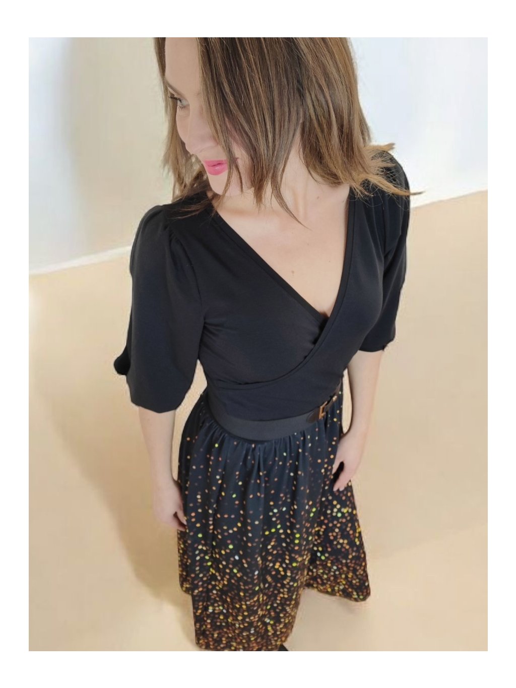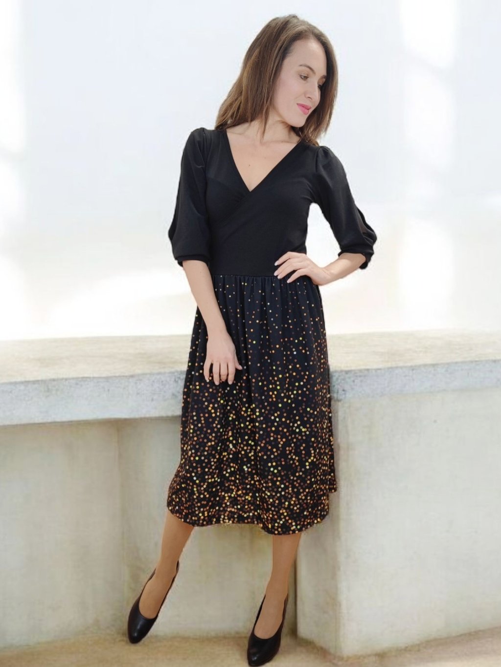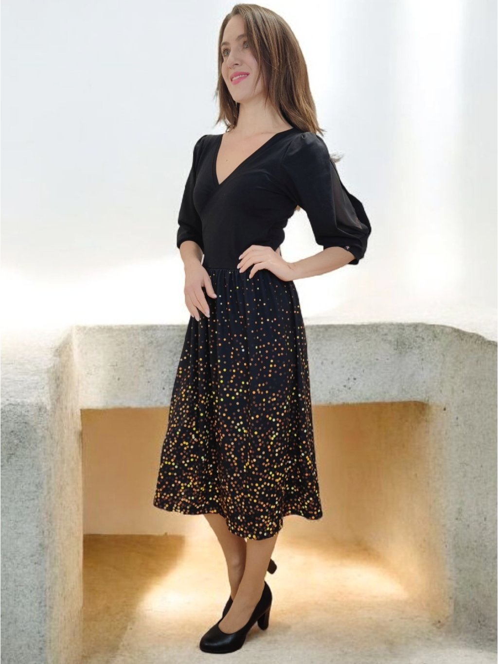 Černý živůtek dodává šatům základní eleganci, zatímco suknice se zlatým třpytem působí jako hvězdná obloha – každý pohyb zachytává světlo a vytváří jemný třpyt. Celkový efekt působí slavnostně, sofistikovaně a s nádechem luxusu – přesně pro chvíle, kdy chcete vyniknout.