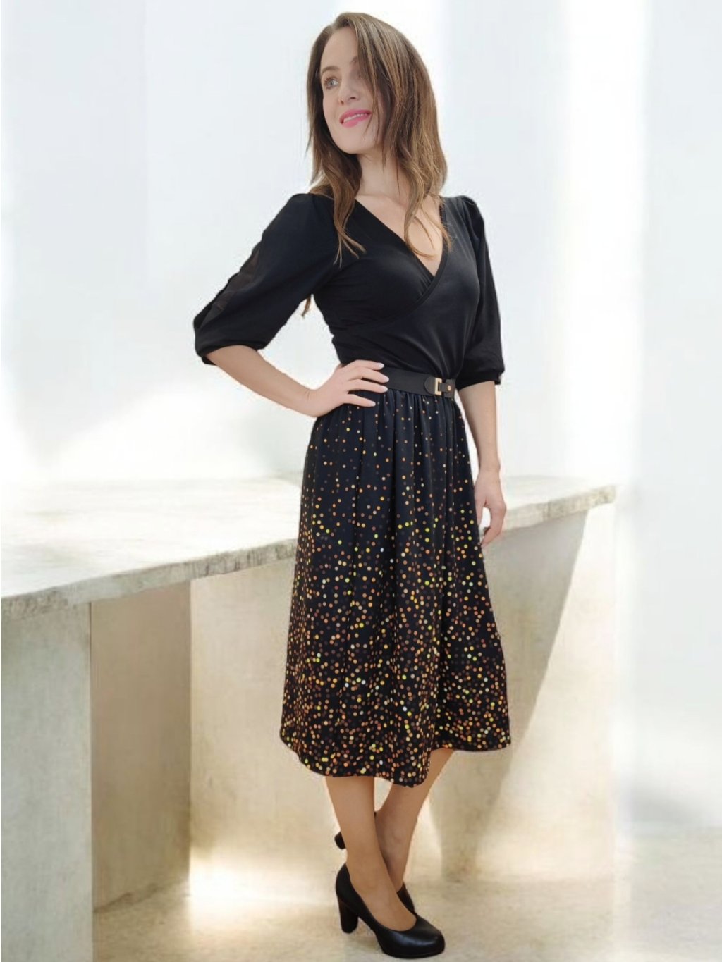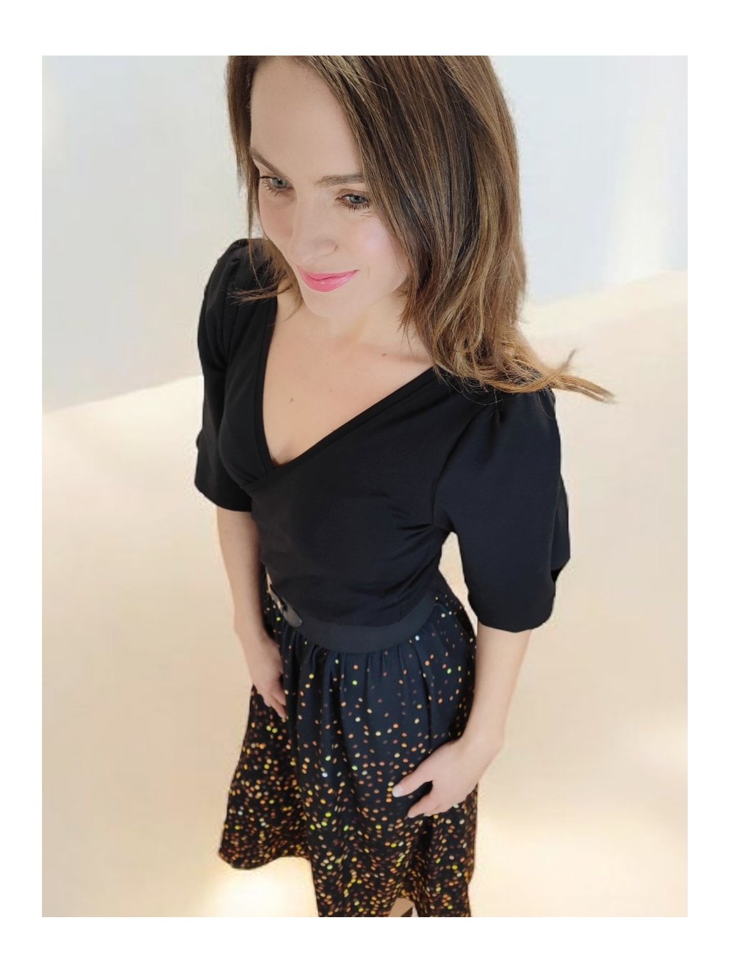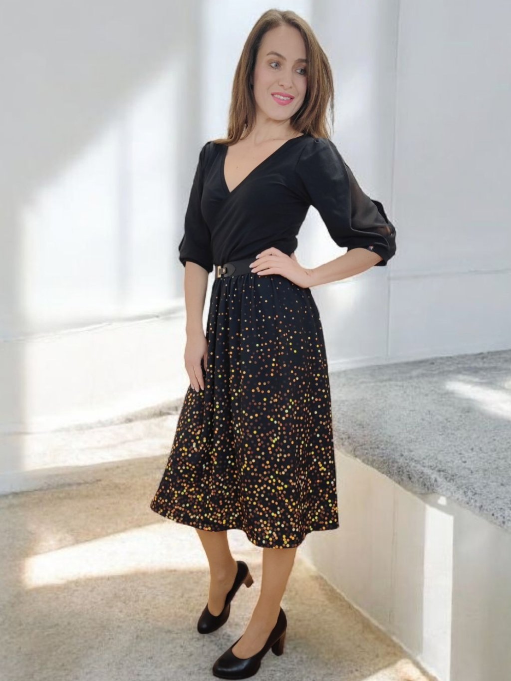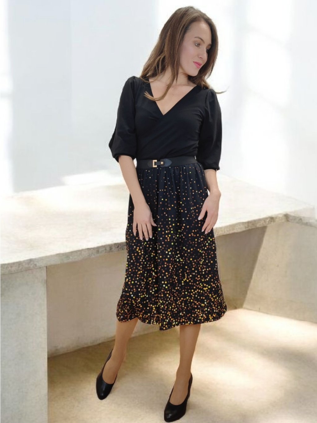 Černý živůtek dodává šatům základní eleganci, zatímco suknice se zlatým třpytem působí jako hvězdná obloha – každý pohyb zachytává světlo a vytváří jemný třpyt. Celkový efekt působí slavnostně, sofistikovaně a s nádechem luxusu – přesně pro chvíle, kdy chcete vyniknout.
