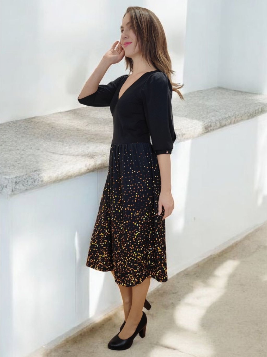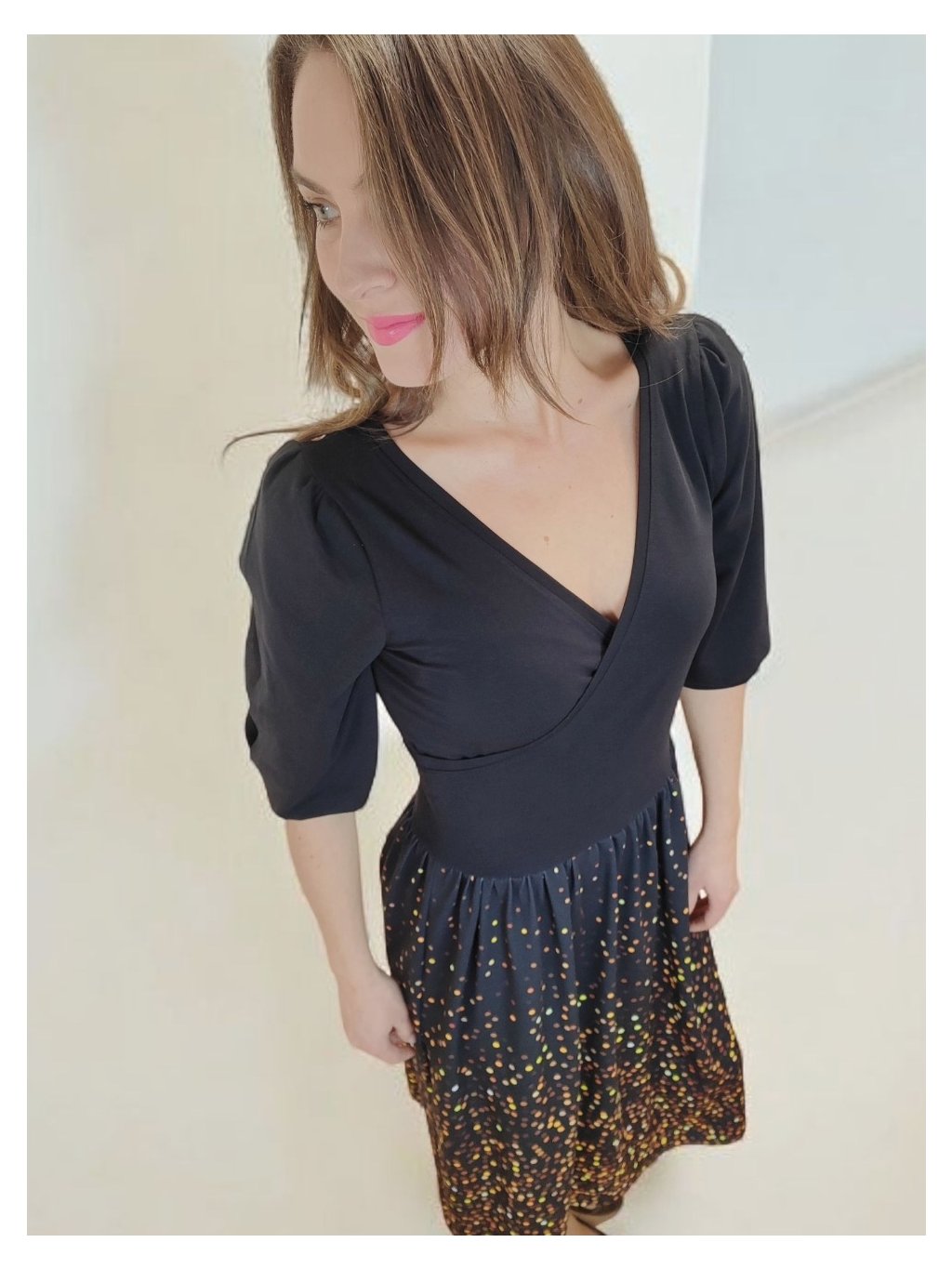 Šaty mají přiléhavý černý živůtek s 3/4 rukávy a nařasenou sukní do pasu.