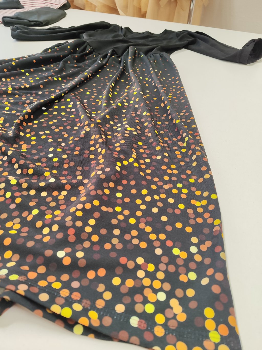 Materiál na sukni je polyester - středně silný, nemačkavý, stálobarevný. Šaty ideální na cesty, do kufru. Víc o materiálu v odstavci O polyesteru s respektem k přírodě.