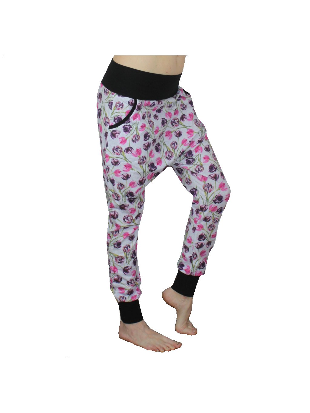 Kalhoty mají snížený rozkrok, jsou volné a rozkrok je až cca v půlce stehen. V bocích kají kalhoty kapsy s lemem. |