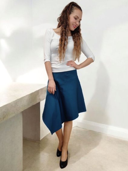 Oproti volnému tričku KLAUDIE má tričko střihu ZOE hlubší výstřih a užší rukávy.