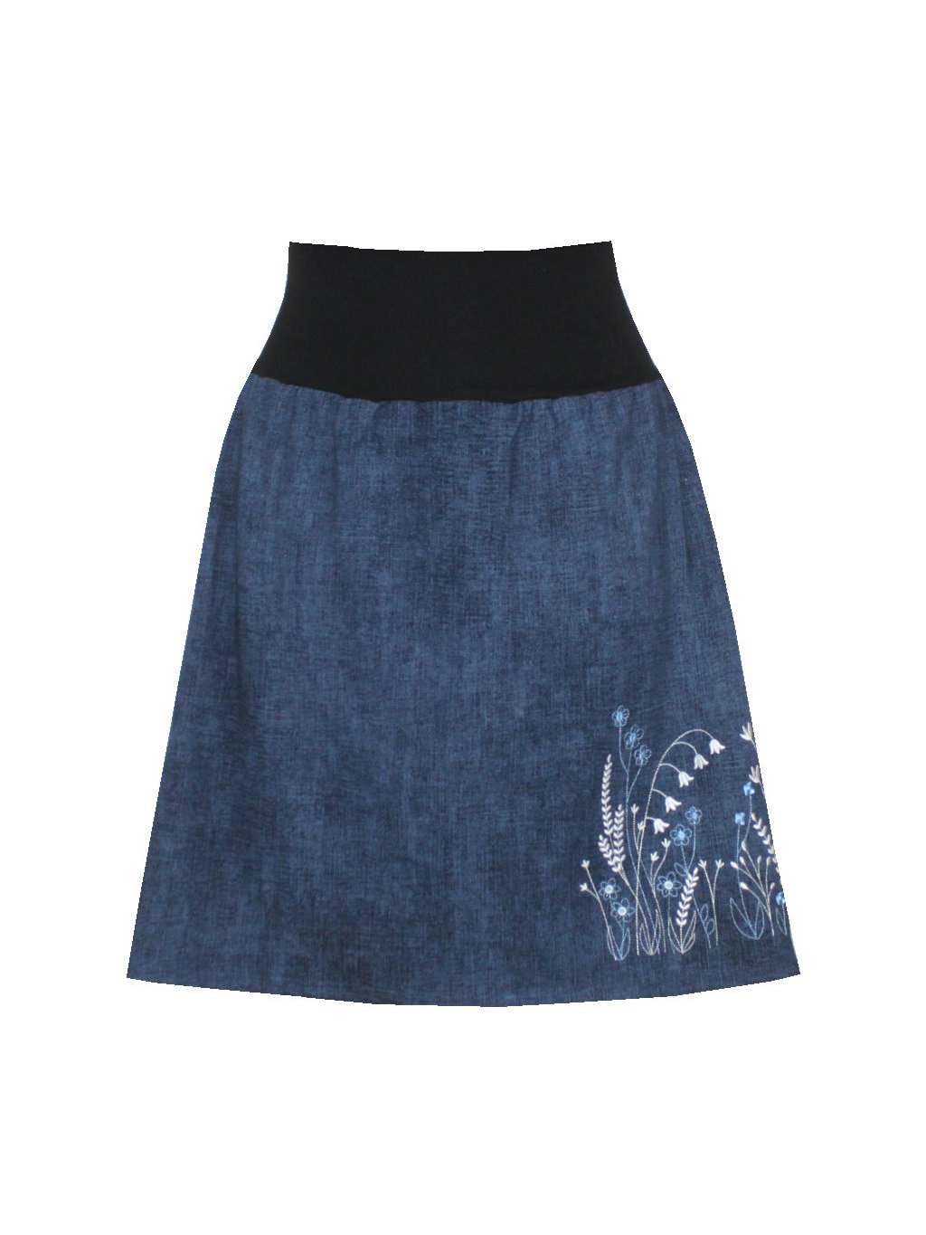 Sukně má výšivku na boku - vícebarevnou louku.