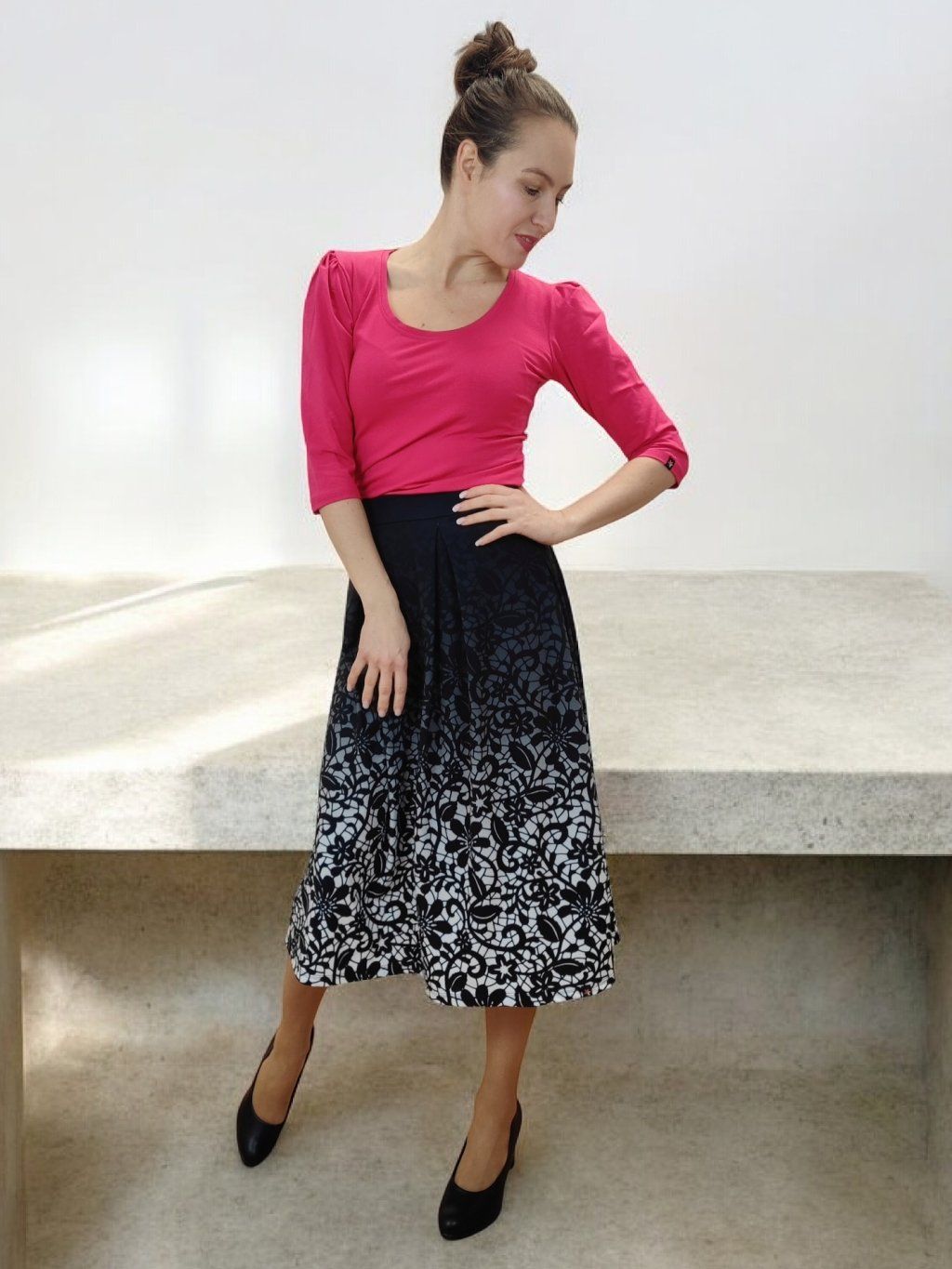 Sukně krásně vynikne s vrškem zastrčeným dovnitř, aby byl zvýrazněný pas.