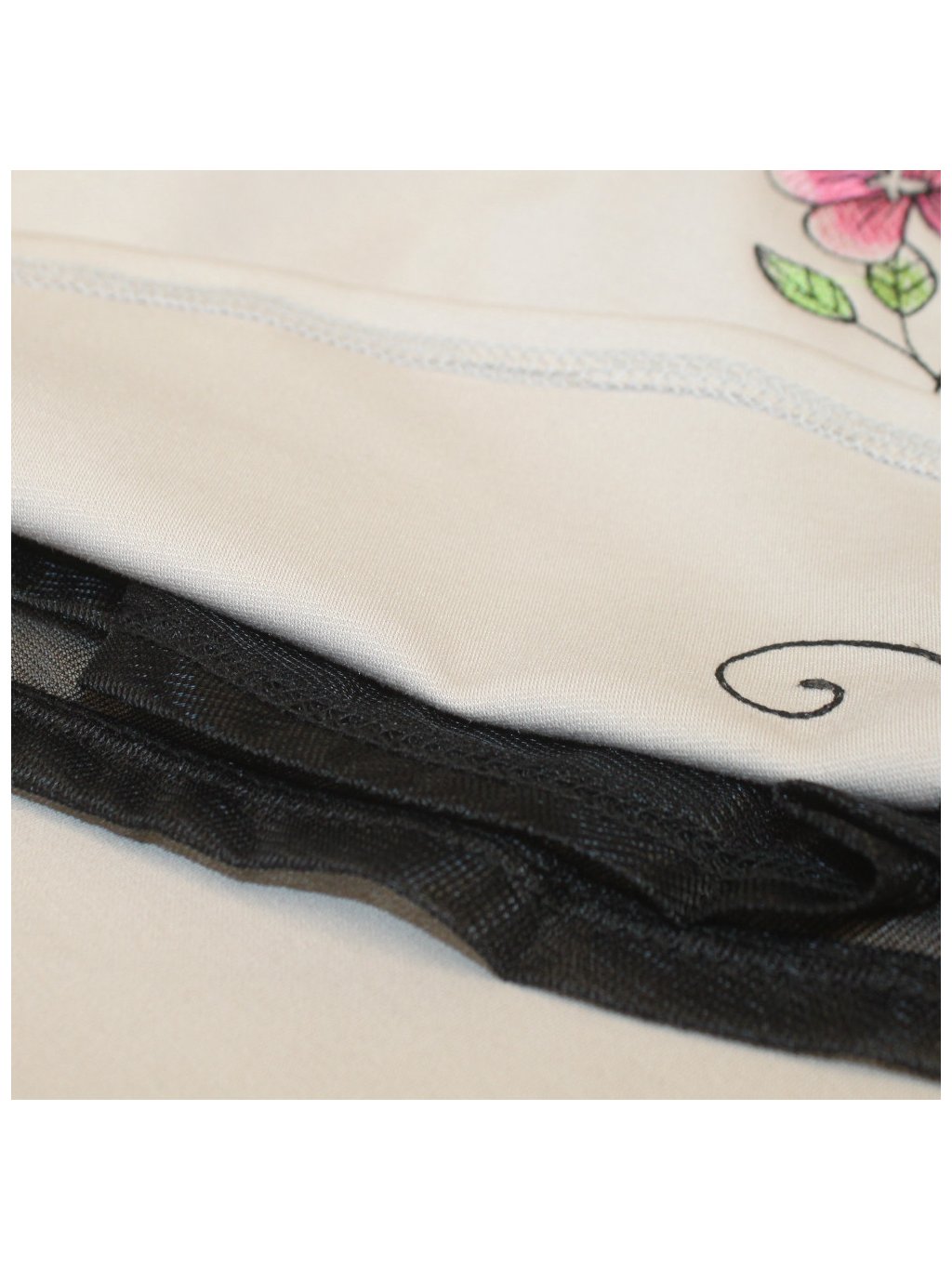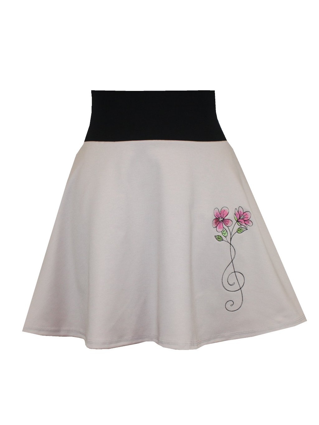 Světle béžová sukně je půlkolového střihu s výšivkou houslového klíče s květinkami.