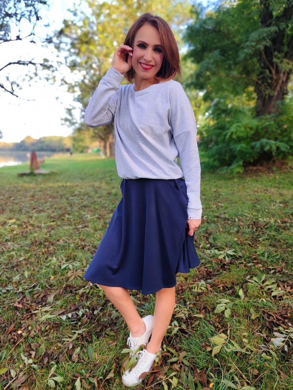 Mikina se snadno kombinuje a skvěle se hodí k sukním z naší nabídky. Perfektně vypadá v kombinaci k sukním do pasu. Například ke střihu VERENA nebo AGÁTA.