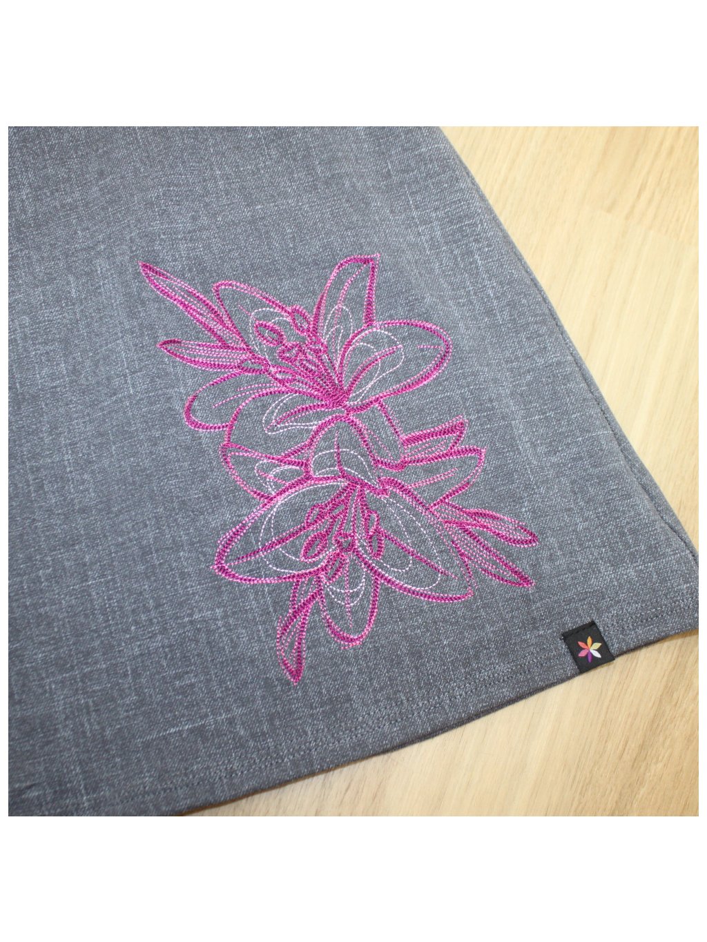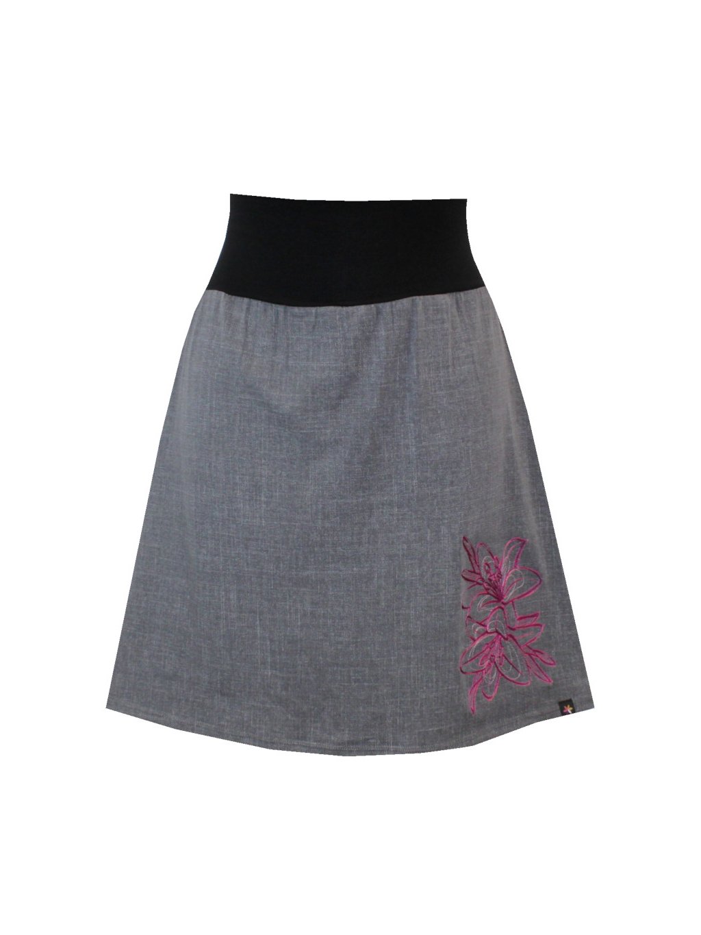 Áčková sukně ze světle šedé imitace džínoviny s výšivkou lilie.
