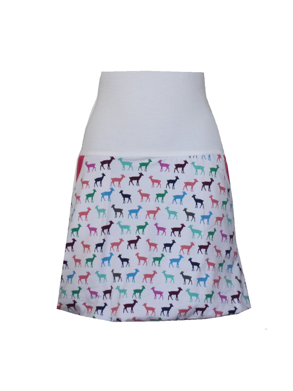 Letní bílá sukně s vysokým pasem a potiskem jelínků na předním díle.