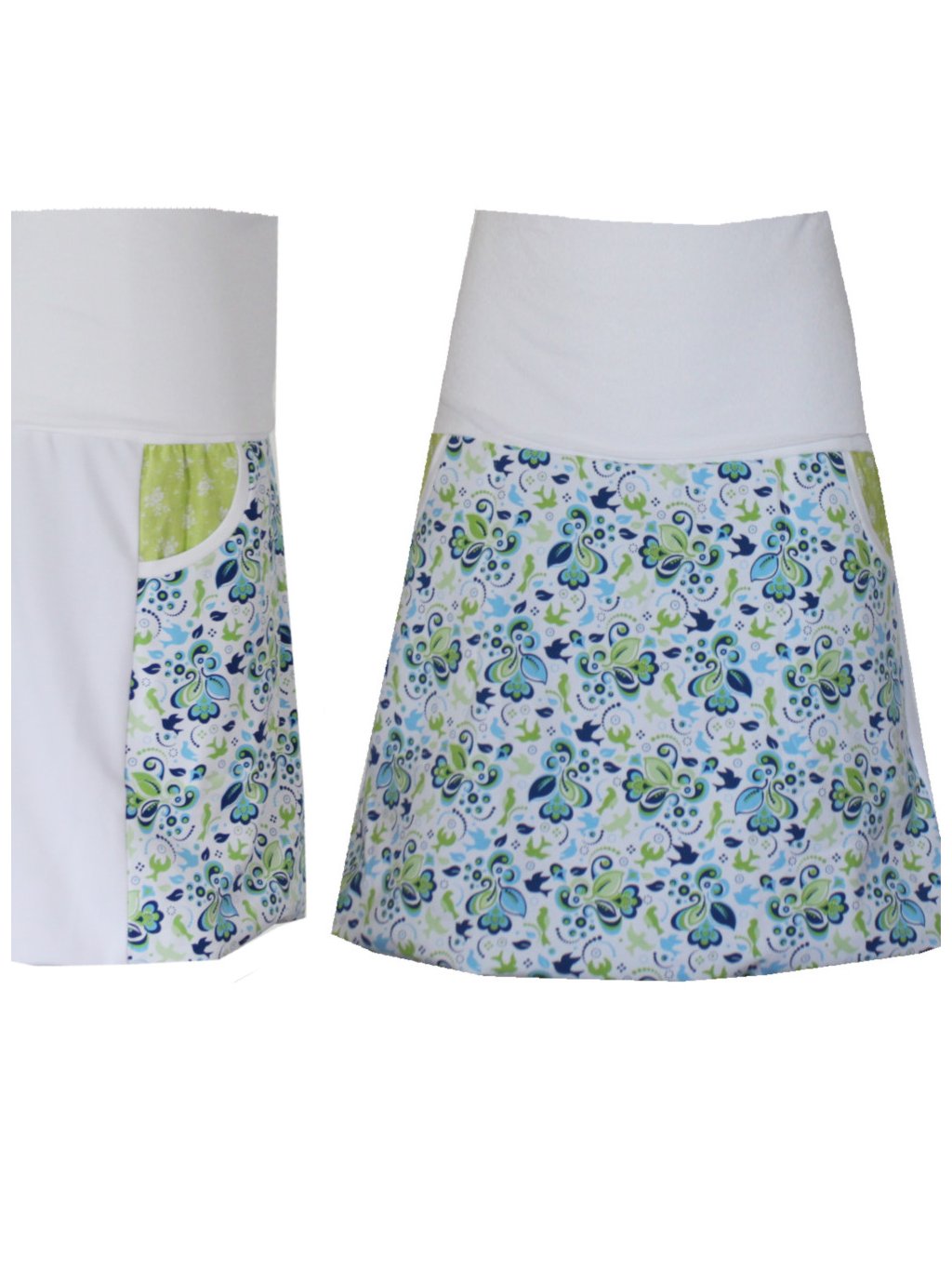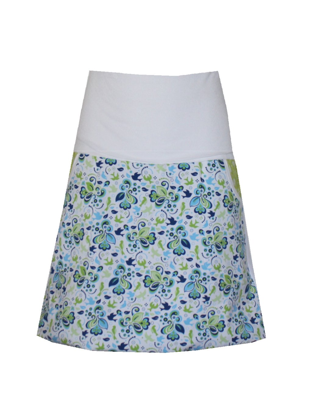 Letní těhotenská bílá sukně s vysokým pasem s modro zelenými vzory na předním díle.