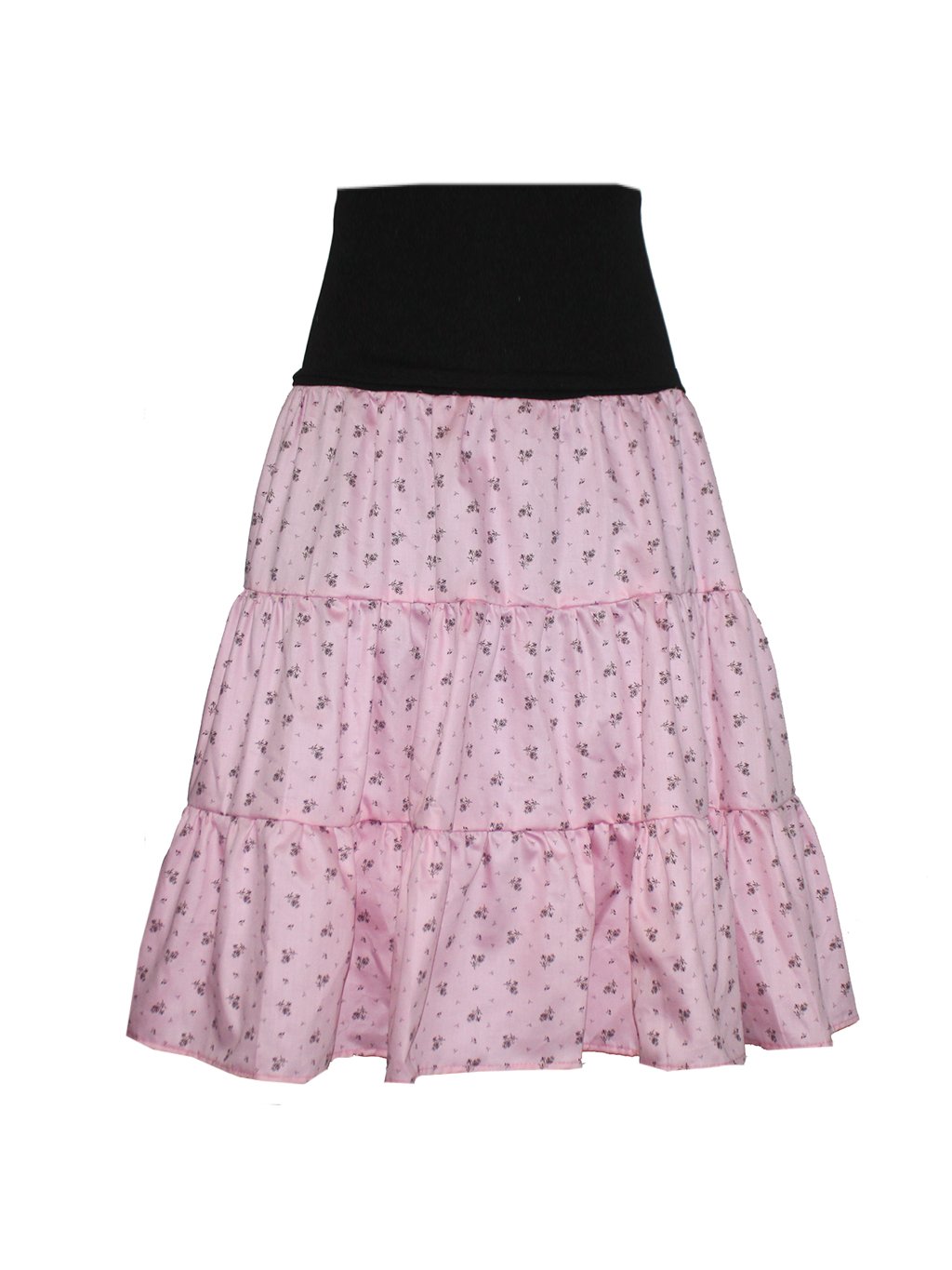Volánová sukně s vysokým pasem, délka pod kolena, růžová s kvítky