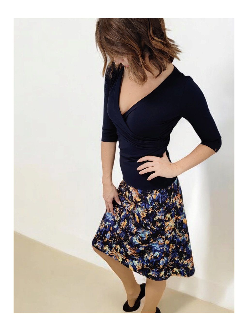 Přední díl je řešený překřížením, které vytváří výstřih do V. Ten opticky prodlužuje krk a zvýrazňuje dekolt.