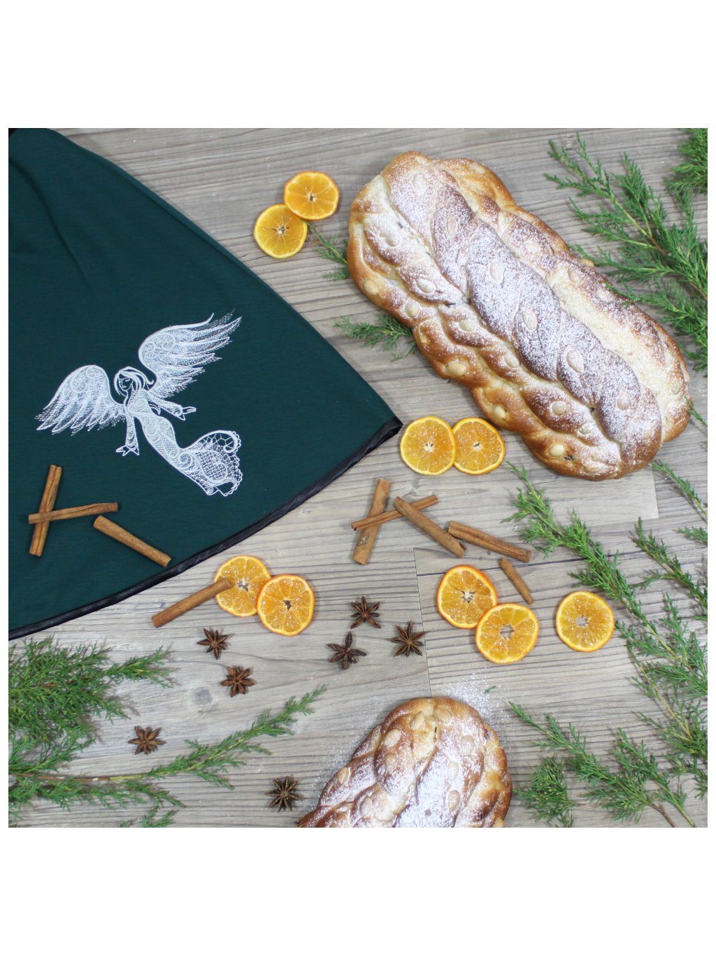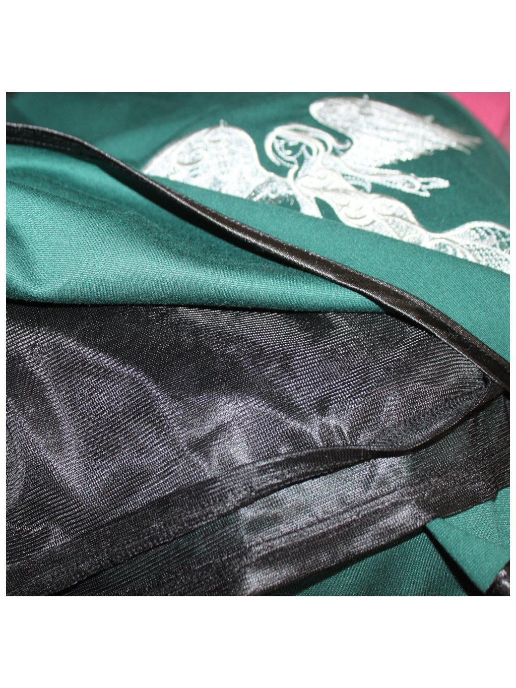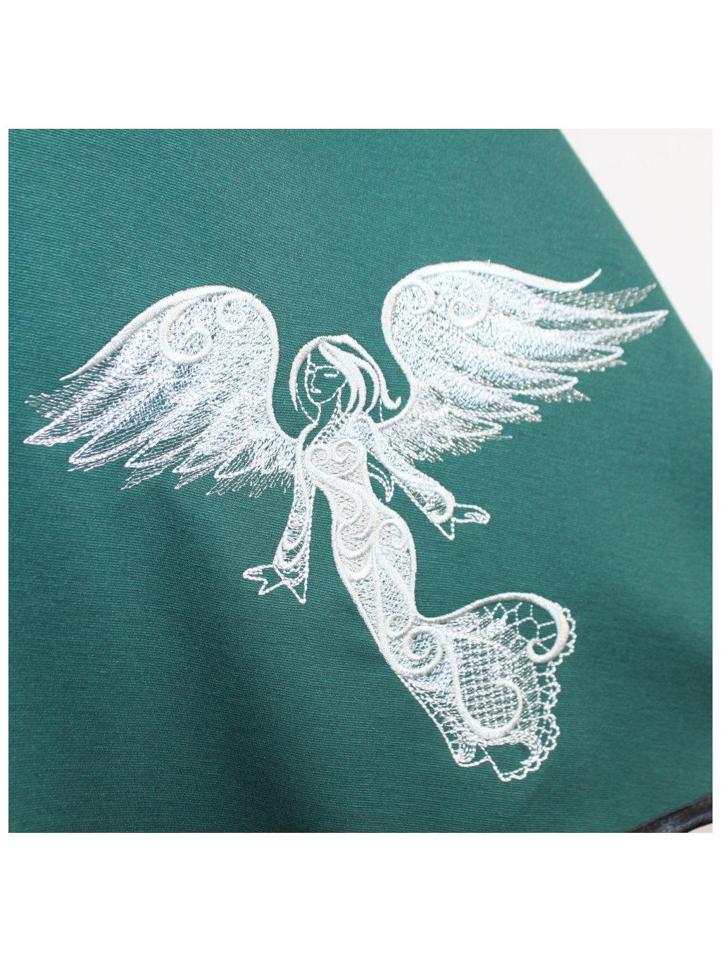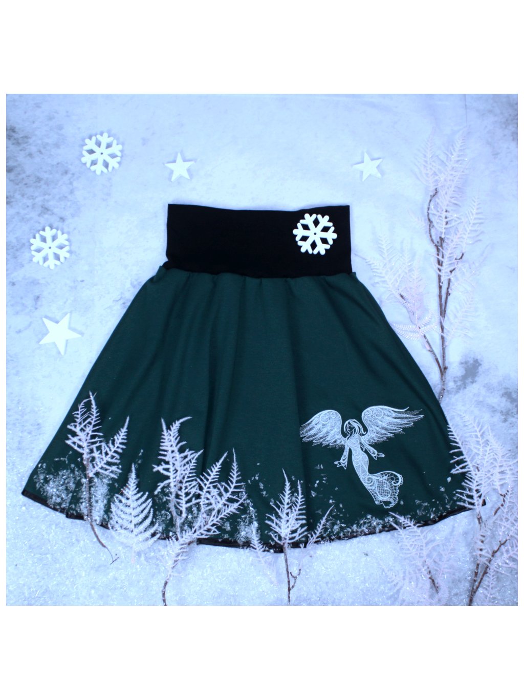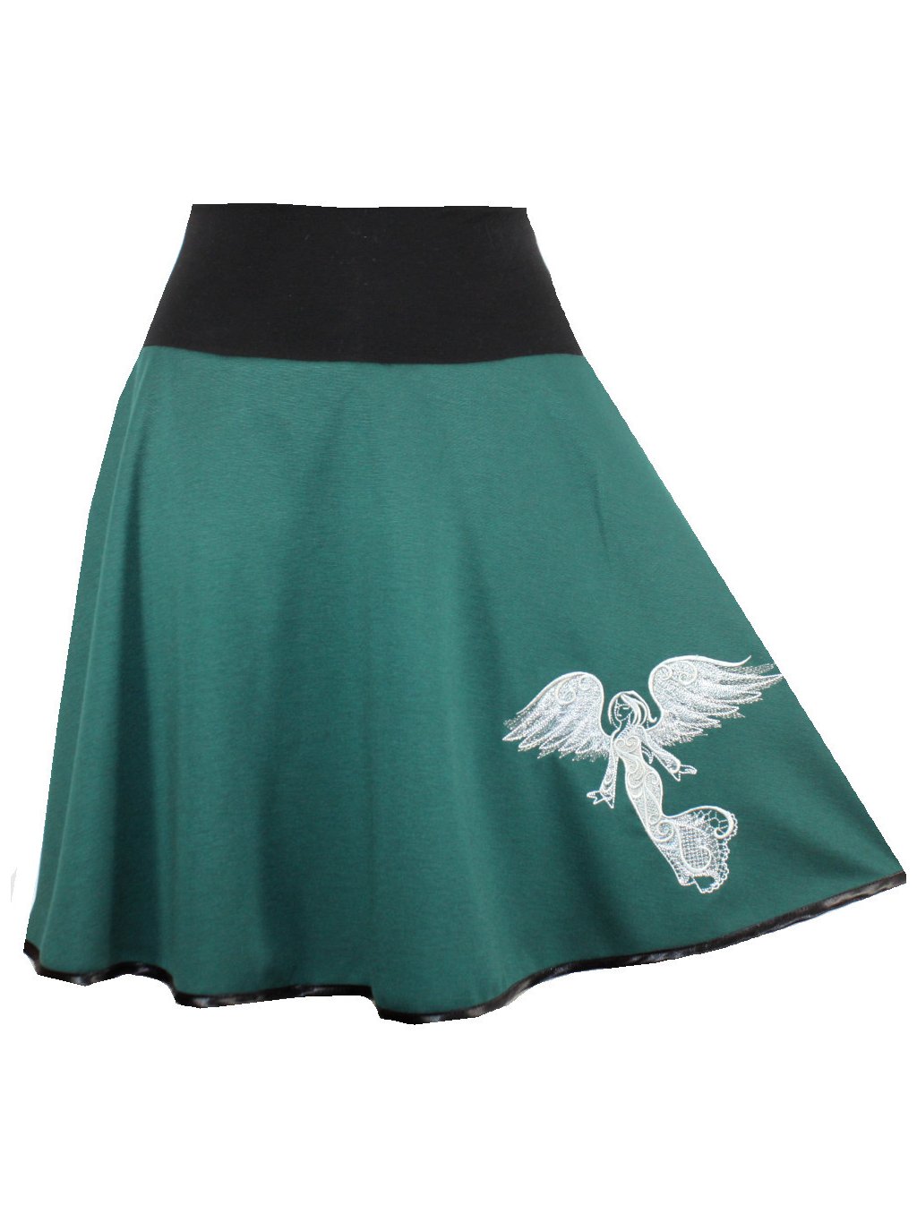Tmavě zelená půlkolová sukně s výšivkou, lem, anděl