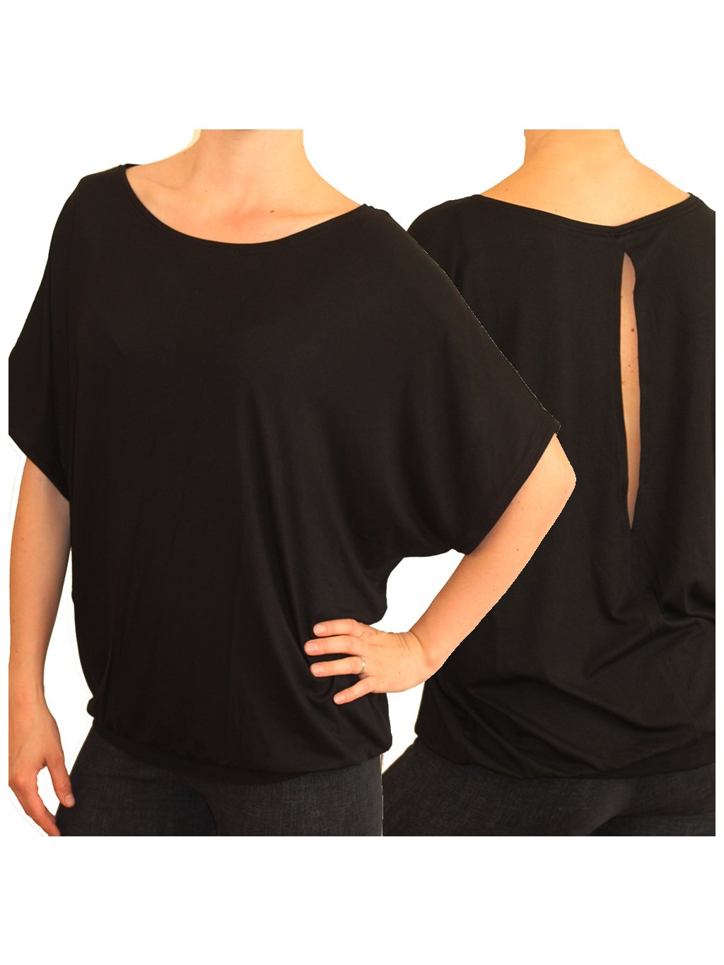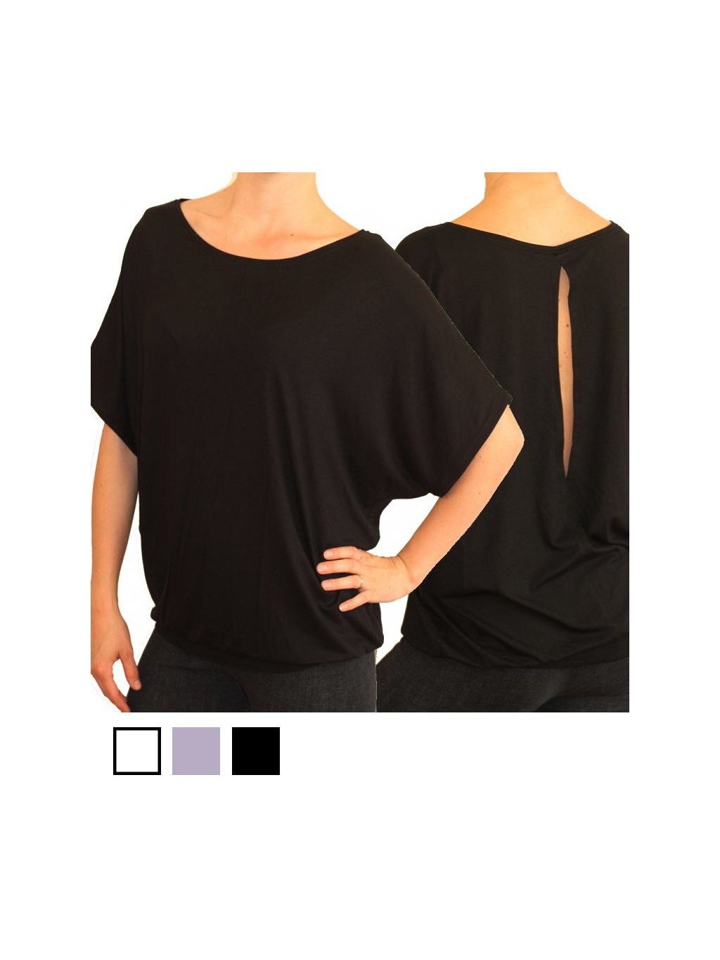 Tričko má "netopýří" střih = volné rukávy. Tričko má celkově hodně volný střih, je delší, může se nosit podkasané. Průkrčník cca 10 cm hluboký, kulatý s obrubou a prošitím. Rukávky jsou zakončené úzkým lemem. Triko je vhodné i pro hodně velká prsa. |