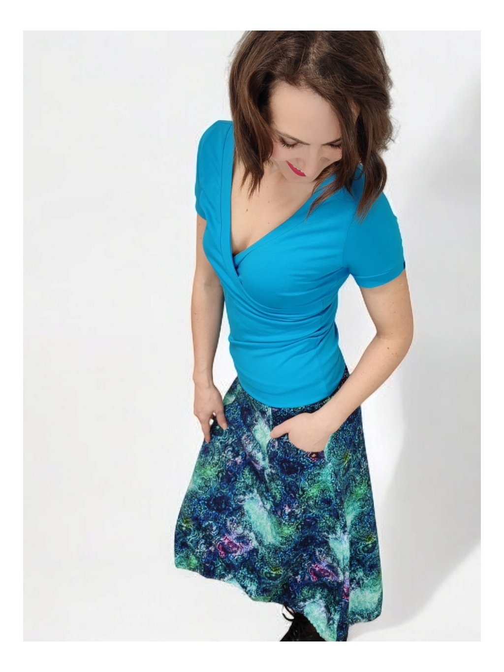Tričko ROSA v tyrkysové barvě je ideální volbou pro teplejší dny i celoroční vrstvení. Překřížený výstřih na prsou vytváří jemnou V linii, která působí žensky a opticky prodlužuje siluetu. Krátké rukávy zajišťují pohodlí v létě a zároveň umožňují snadné kombinování pod sako nebo kardigan.