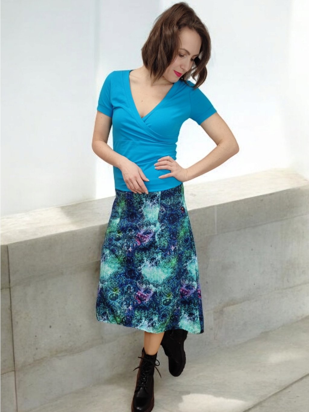 Tričko ROSA se hodí pro ženy, které hledají bavlněné tričko s krátkými rukávy s lichotivým střihem. Překřížený výstřih zvýrazňuje siluetu a tyrkysová barva dodává energii a svěžest. Vhodné do práce, na léto i pro každodenní nošení.