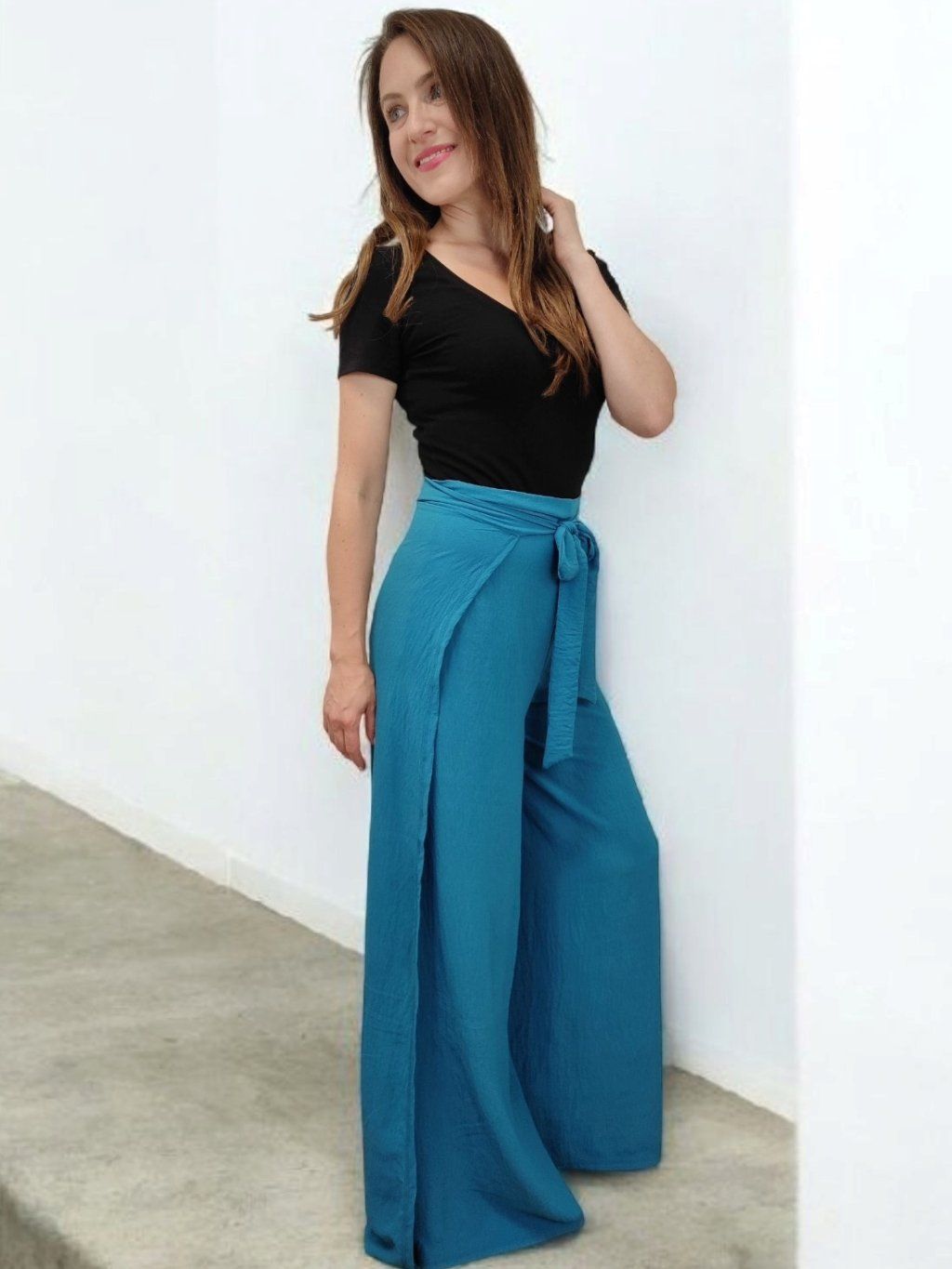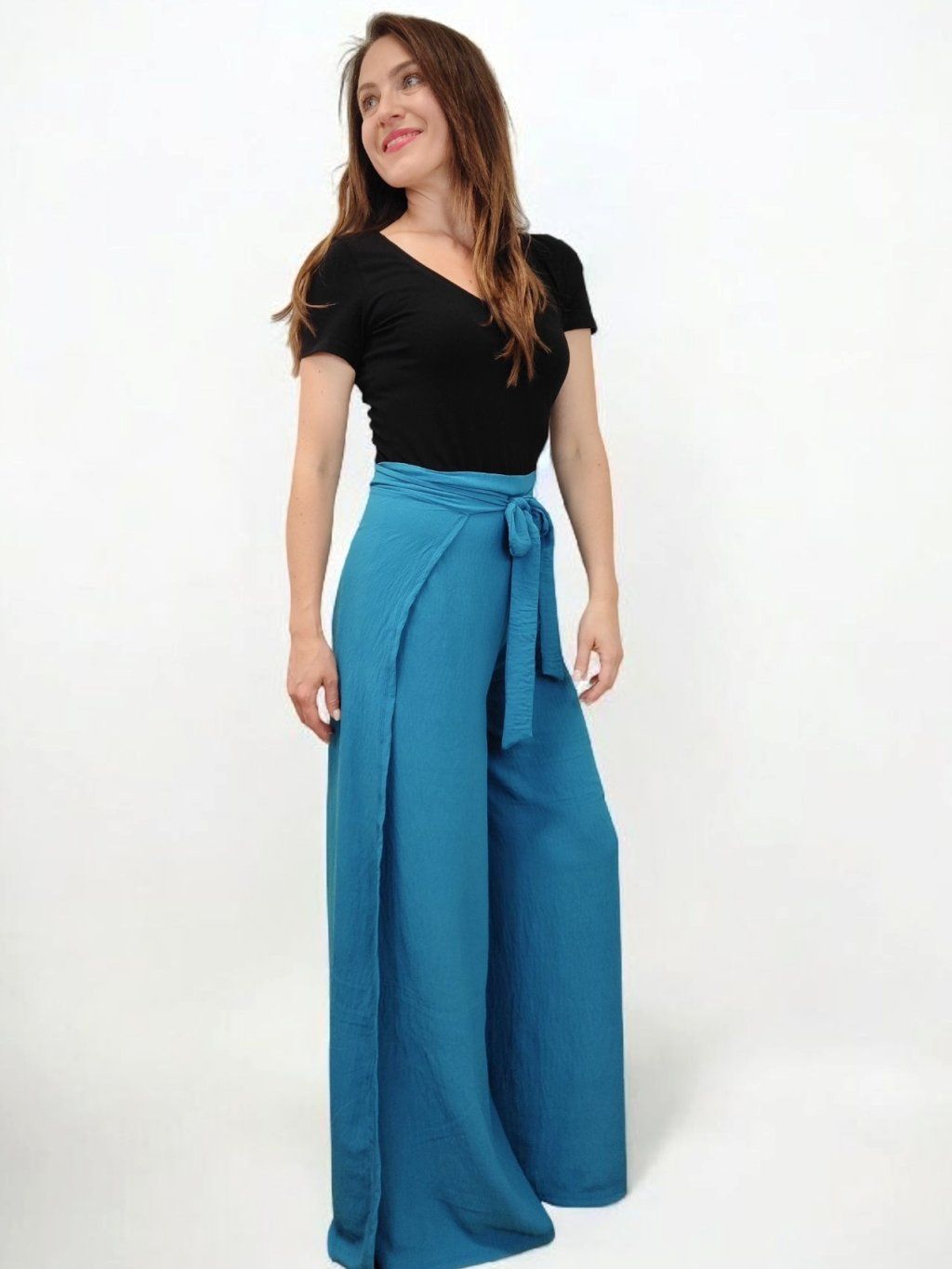 Zavinovací kalhotová sukně Wanaki Calm je spojením pohodlí, stylu a originality. Má rozevlátý střih, který na první pohled připomíná sukni, ale poskytuje komfort volných nohavic. Zavinování na vázačku umožňuje přizpůsobení obvodu pasu – je tedy vhodná i pro proměnlivou postavu. Látka je příjemná, lehká a splývavá, což oceníte nejen ve městě, ale i na dovolené. Tyrkysová barva působí osvěžujícím a klidným dojmem, a krásně ladí s bílými, krémovými i tmavšími tóny. Kalhotovou sukni snadno sladíte s jednoduchým tričkem, crop topem i lněnou košilí. Tento kousek šijeme v malém množství v našem ateliéru, a pokud si přejete drobné úpravy, rády vám vyjdeme vstříc. Ať už se vydáte do města, na pláž nebo na letní slavnost – Wanaki Calm bude vaším spolehlivým a elegantním společníkem.