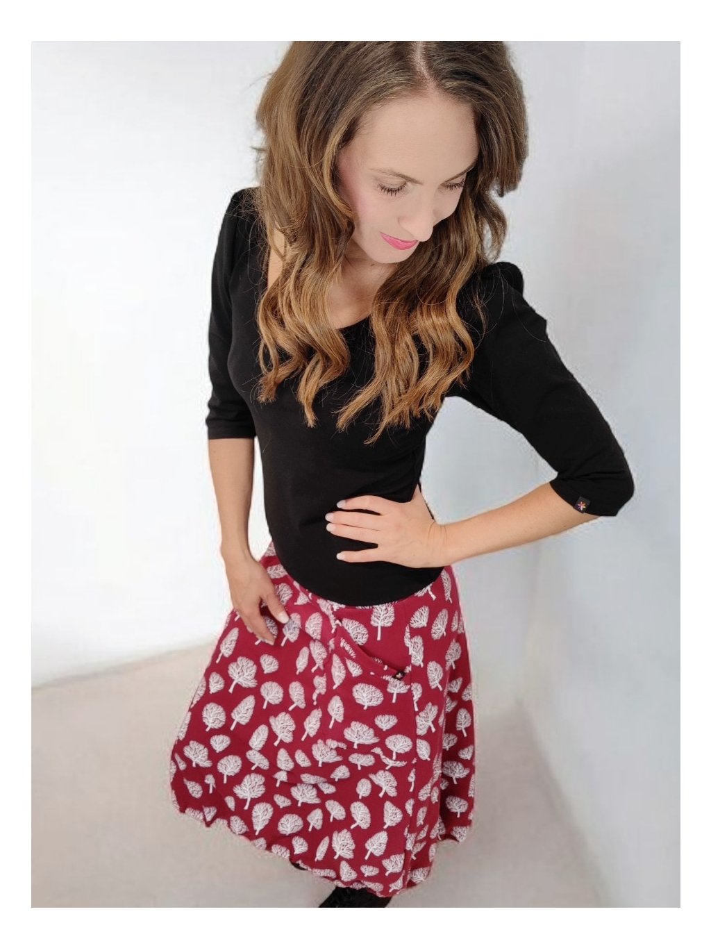 Vínový podklad doplňuje jemný potisk stromečků, který působí hravě, ale zároveň zůstává decentní. Připomíná zimní přírodu a dodává sukni osobitý charakter.