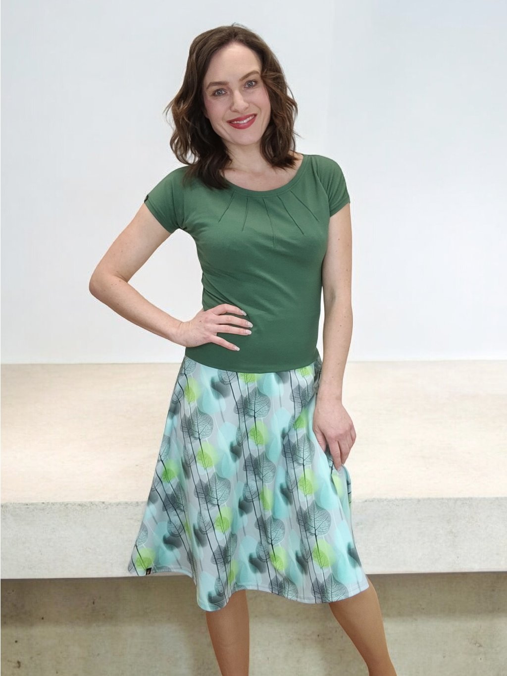 Tato sukně se skvěle kombinuje s různými typy triček, halenek nebo svetříků. Doporučujeme zvolit jemné pastelové tóny, neutrální barvy nebo doplňkové odstíny, které ladí s motivem „Zelené snění“.