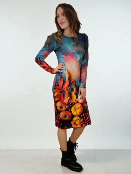 Šaty mají stojáček u krku, 3/4 rukávy, volný střih, která je rozšířený k dolnímu kraji a šaty mají prodloužený zadní díl o cca 13 cm oproti přednímu dílu. Šaty mají protisklad na zadním díle.